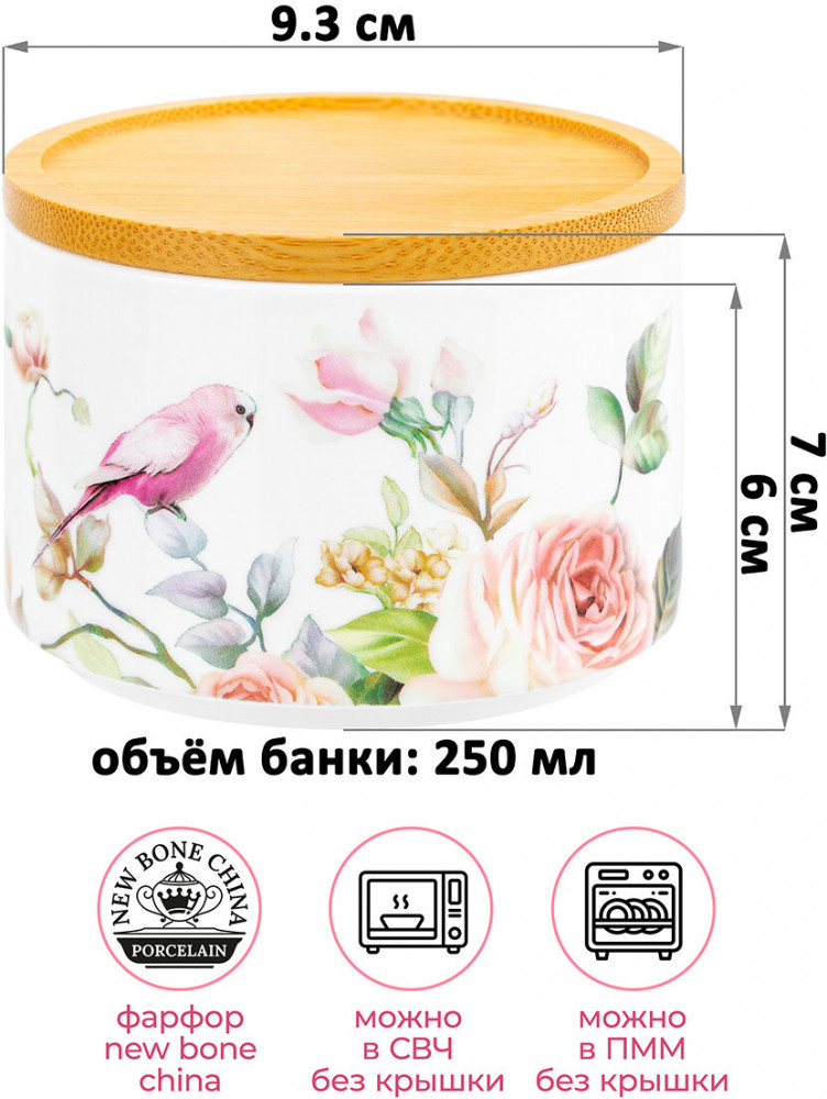 💳 Оплатить за товар можно при получении 🇰🇿 Есть бесплатная доставка по Казахстану от 1 дня 🎁 Копите бонусы с каждой покупки Серия: Певчие птички Набор 2 банок с бамбуковыми крышками от Elan Gallery послужит для организации хранения продуктов на вашей кухне. Размер каждой ёмкости — 9.3×9.3×7 см, объём — 250 мл. Высота без крышки — 6 см. В набор входят банки «Певчие птички на чёрном» и «Певчие птички». Изготовлены из фарфора нового поколения new bone china. От классического костяного фарфора он отличается большей экологичностью в производстве. За счёт гладкости стенок фарфоровая посуда легко отмывается, поэтому сохраняет привлекательный внешний вид и практична в использовании. Каждая банка украшена изображениями птичек и розовых цветов. Крышки выполнены из натурального бамбука и оснащены силиконовыми уплотнителями. |