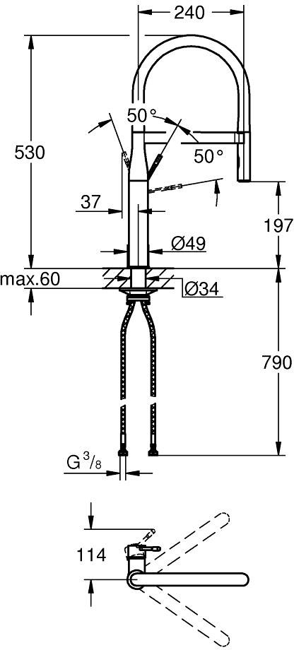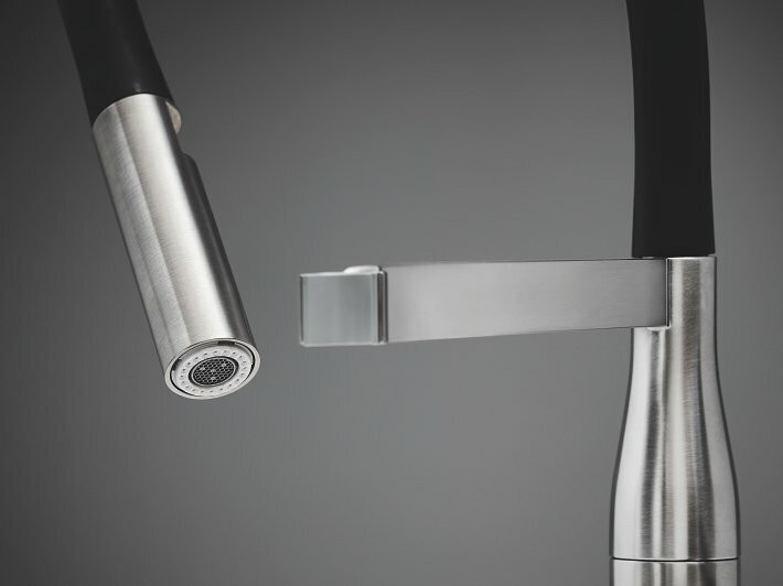 Высокий поворотный C-излив с выносом 24 см и высотой 19.7 см обеспечивает комфорт при работе с крупной посудой. Радиус вращения 360° расширяет рабочую зону мойки. Смеситель оснащён профессиональной металлической выдвижной лейкой с гибким силиконовым шлангом GROHflexx kitchen. Автоматический переключатель позволяет выбирать между аэратором и душевой струёй SpeedClean, при этом после выключения вода автоматически возвращается в режим аэратора. Система GROHE EasyDock M с встроенным магнитом обеспечивает точную и надёжную фиксацию лейки.