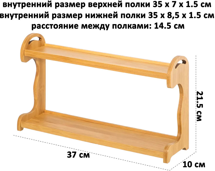 💳 Оплатить за товар можно при получении 🇰🇿 Есть бесплатная доставка по Казахстану от 1 дня 🎁 Копите бонусы с каждой покупки Полочки подойдут для размещения банок и ёмкостей со специями, а также столовых приборов. Выполнена из натурального бамбука. Общий размер изделия — 37×10×21.5 см. Внутренний размер нижней полки — 35×8.5×1.5 см, внутренний размер верхней полки — 35×7х1.5 см. Расстояние между ярусами — 14.5 см. Полочки подойдут для размещения банок и ёмкостей со специями, а также столовых приборов. Кроме того, изделие можно использовать для сервировки закусок в качестве необычной этажерки. Благодаря внутренним выемкам на каждом ярусе можно разместить тарталетки, нарезку из сыра и мяса, а также небольшую выпечку. Подойдут для фруктов и ягод — выложите на них виноград или клубнику. |