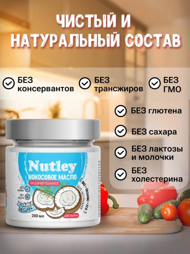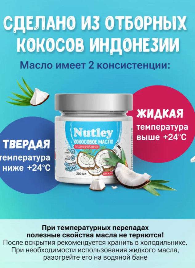 Натуральное кокосовое масло Nutley — это идеальное решение для разнообразия в вашей кухне. Оно обладает неповторимым ароматом и нежной текстурой, которые делают его незаменимым компонентом для приготовления различных блюд. Пищевое масло превосходно подходит для жарки еды и придает блюдам насыщенный вкус и аромат. В умеренных количествах масло кокосовое без глютена оказывает диетическое влияние на массу тела и состав. Оно содержит низкое количество калорий и является прекрасным пп (правильное питание) и зож продуктом для похудения, также подойдет людям, придерживающихся кето (keto) диеты или низкоуглеводного питания. Это масло является не только отличным соусом, но и незаменимым продуктом в бакалеи. Исследования показали, что правильное кокосовое масло предотвращает болезнь Альцгеймера, создавая источник энергии, который поддерживает функцию мозга и улучшает память. Данный продукт питания увеличивает полезный уровень холестерина и снижает риск сердечных заболеваний. Поставляется в надежной упаковке. Также продукт часто используют в косметологии: как увлажняющее средство для волос и кожи лица, тела, для масок, в качестве крема и обертывания. Масло, содержащее каприновую кислоту, оказывает противогрибковый и противовоспалительный эффект. Кокосовое средство для красоты эффективно от разных видов грибков. Женщины также отмечают восстанавливающий эффект, используют его для загара. Такая косметика оказывает положительный эффект на сухие секущиеся кончики волос. Питательное масло для поврежденных волос пользуется популярностью у взрослых девушек и подростков. Масло «сухое», его удобно наносить на кожу. Органическое интенсивное увлажнение кожи — важный фактор для профилактики растяжек у беременных, в уходе за кожей рук и ног.
