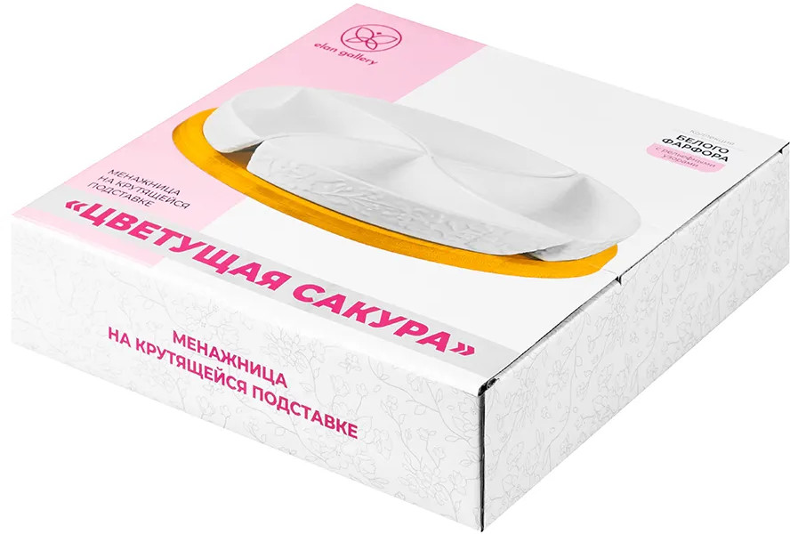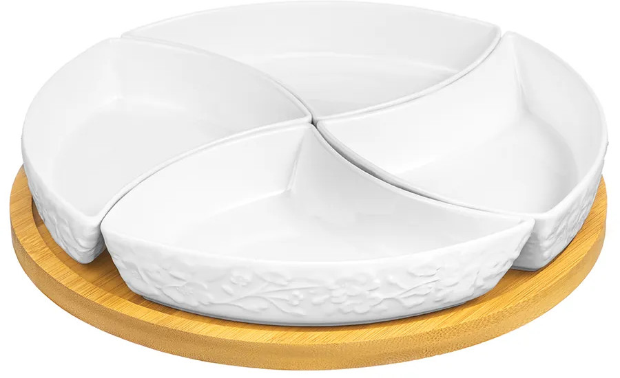 Менажница Elan Gallery «Цветущая сакура» размером 25×25×6 см имеет четыре отделения по 180 мл и крутящуюся подставку. Секции можно вынимать и использовать по отдельности, размер каждой — 17×12×3.5 см. Вращающаяся менажница подойдет для сервировки и подачи различных закусок: сырной и мясной нарезки, канапе, роллов. Сервировочное блюдо пригодится, чтобы создать идеальную атмосферу для приема гостей или романтического ужина дома. Благодаря отдельным секциям вы можете использовать одну и ту же тарелочку для солений, оливок, сыра и колбасы. Такой подход к сервировке позволит сэкономить место на вашем столе. Возьмите менажницу на пикник, её эргономичная форма позволит разместить все необходимые закуски и сладости. Формы выполнены из белого фарфора с декоративными рельефными узорами в виде цветов. Подставка изготовлена из натурального бамбука. Фарфоровая посуда отличается от керамической повышенной плотностью. Фарфор не впитывает цвет продуктов и не деформируется от влаги, чему может быть подвержена керамика.