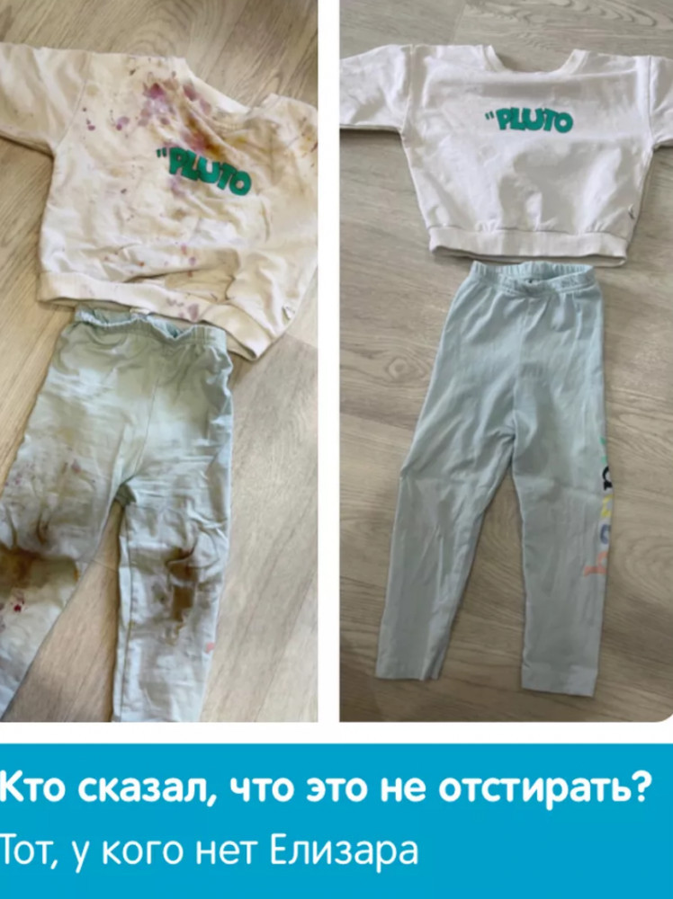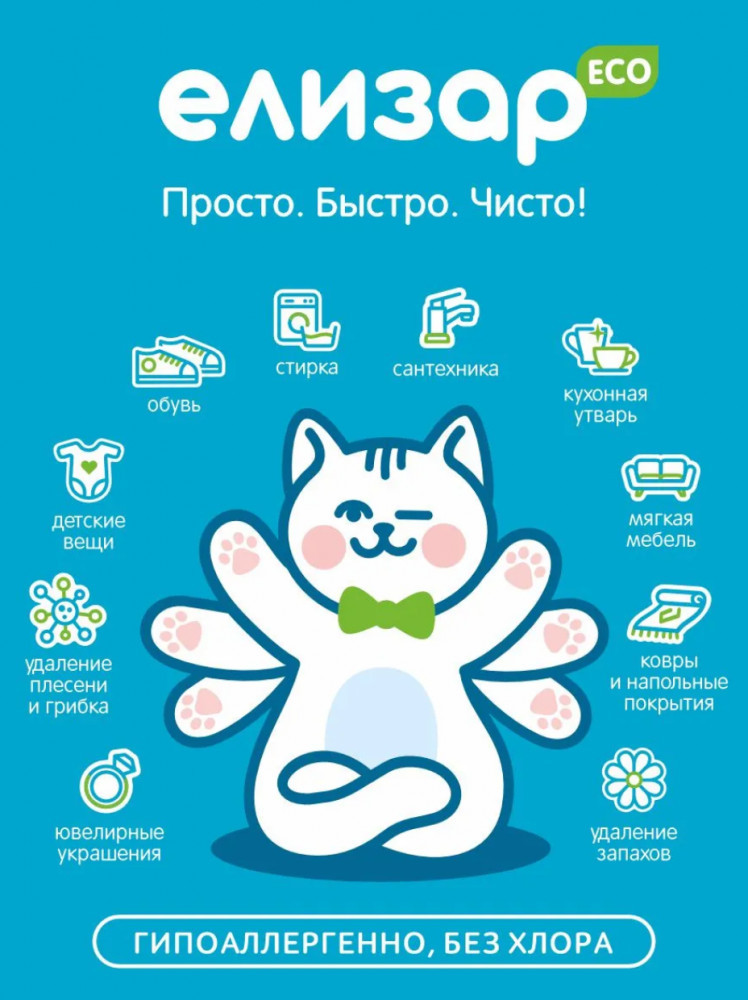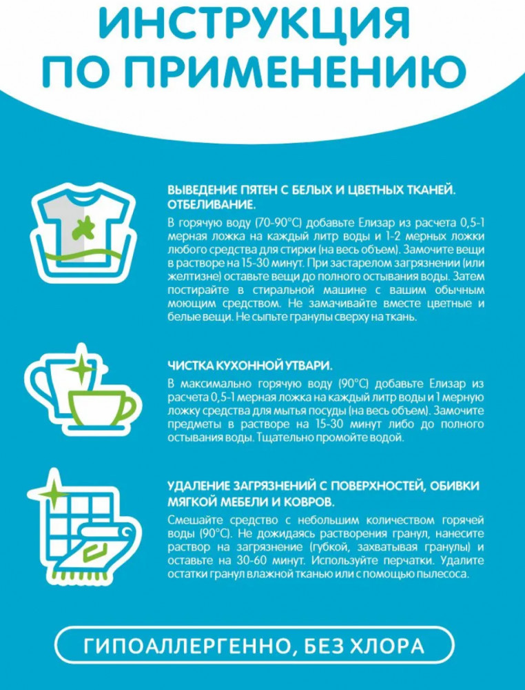 «Елизар» — мощный кислородный пятновыводитель, а также отличная активная добавка — усилитель действия любой бытовой химии для стирки. Средство не содержит хлора и фосфатов, используется как пятновыводитель для цветного белья, для стирки черного белья. Елизар применяется как отбеливатель для белого белья, удаляет желтизну и серость с белых вещей. Эффективно выводит застарелые и въевшиеся пятна органического происхождения: жирные пятна, пятна от пищи, от вина и любых напитков, от травы, одуванчиков, смолы, пятна крови, желтые пятна пота, пятна от йода, зеленки, марганцовки и пр. Мерная ложка в комплекте.