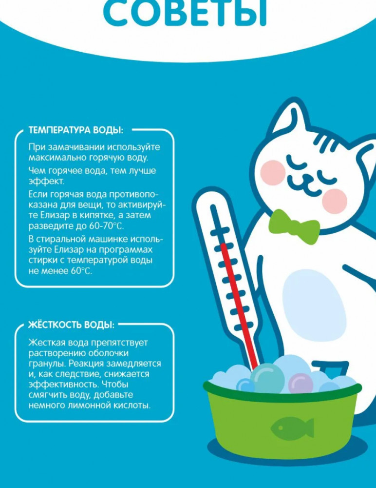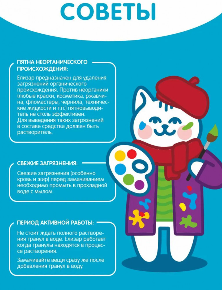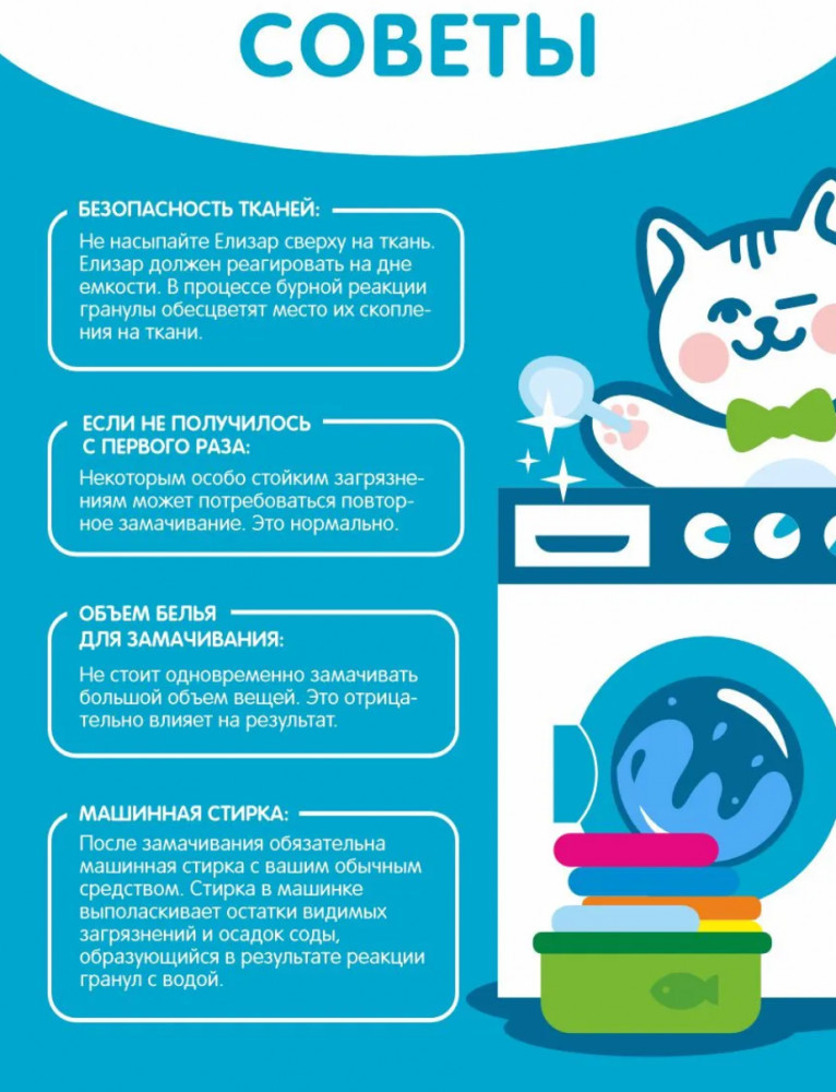 Внимание! Порошок Елизар нельзя применять для шерсти и шелка, натуральной кожи (в т.ч. замши и нубука), пуха и пера, мембранных тканей, изделий из алюминия, меди, дерева. Не предназначен для выведения пятен от красок (акварель, гуашь), чернил, косметики, ржавчины, технических жидкостей и прочей неорганики. Запрещено смешивать со средствами, содержащими хлор (например, белизна).