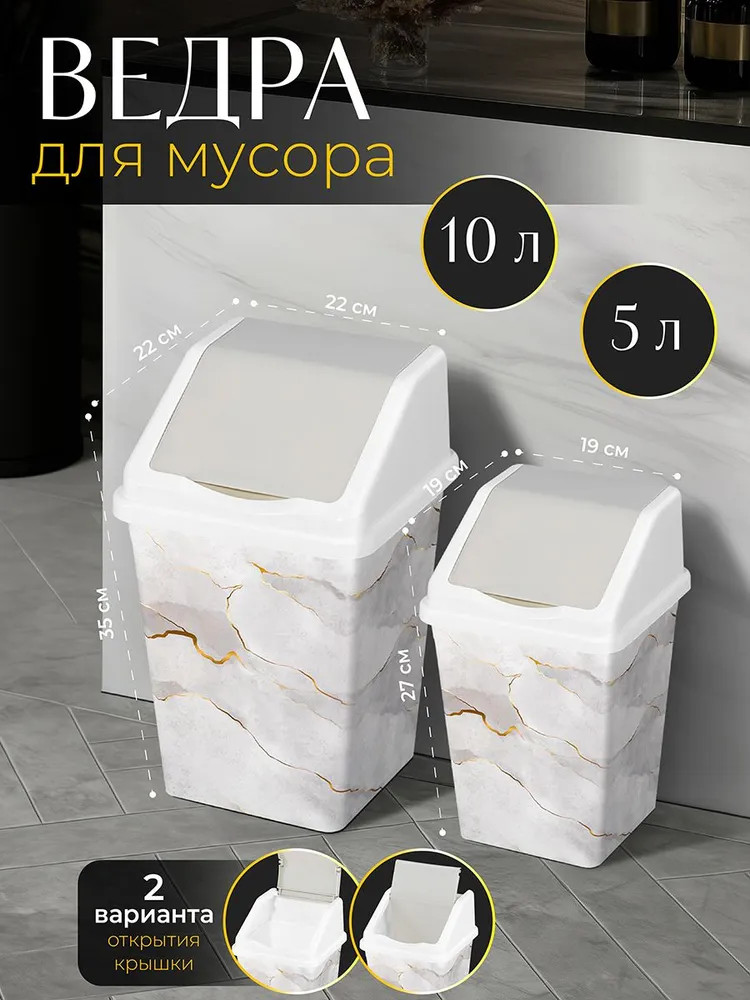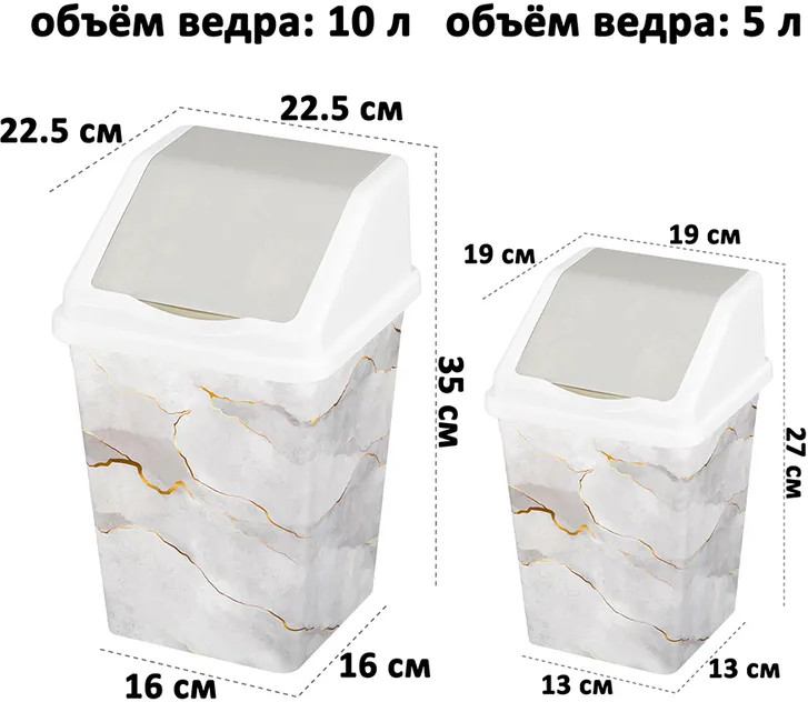 Оптимальный размер бака пригодится для различного мусора и пищевых отходов и подойдет для кухни, туалета или ванной, будет уместно у туалетного столика или в рабочем помещении, офисе. Мусорное ведро можно использовать как напольное или настольное, поставить его на тумбочку или под раковину. Корпус вместительного ведра изготовлен из прочного пластика, имеет небольшой вес и устойчив к механическому воздействию. Использование нескольких мусорных контейнеров позволит организовать сортировку и раздельную утилизацию отходов. В наборе 2 ведра — объемом (с учетом подвижной крышки) — 5 литров и 10 литров. Размеры изделия 5 литров — 190×190×270 мм, 10 литров — 225×225×350 мм.