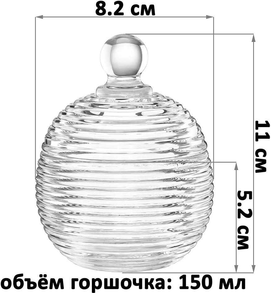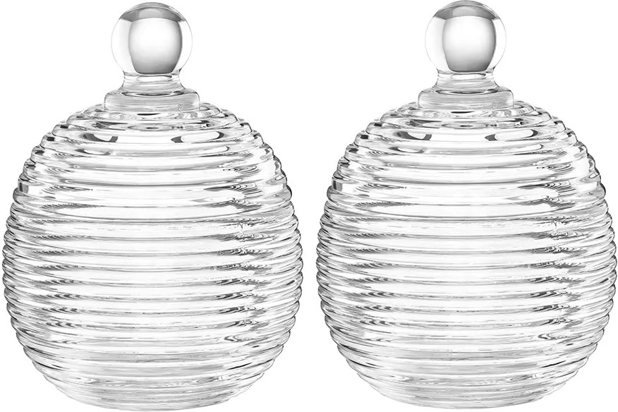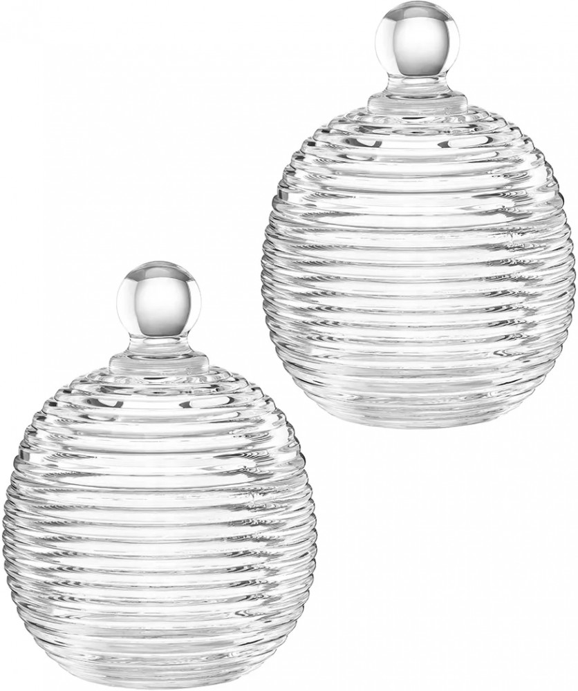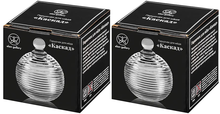 Набор 2 горшочков для мёда Elan Gallery «Каскад» с крышками выполнен из стекла и украшен декоративным рельефным узором в виде горизонтальных полосок. Размер каждого изделия — 8.2×8.2×11 см, объём — 150 мл. Высота без крышки — 5.2 см. Прозрачная баночка с полосатым рельефом и перламутровым сиянием подойдёт для хранения мёда, варенья, сахара и соли. Можно использовать её как ёмкость для чая, кофе и других сыпучих продуктов. Декоративная баночка круглой формы станет гармоничным дополнением при сервировке вашего стола как в будни, так и на праздник. Красивый дизайн позволит использовать её не только для хранения продуктов, но и для подачи на стол. Положите в неё конфеты или икру, чтобы удивить гостей изящной сервировкой.