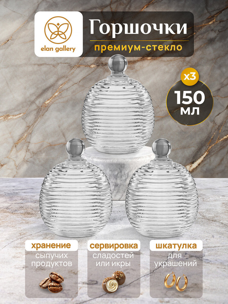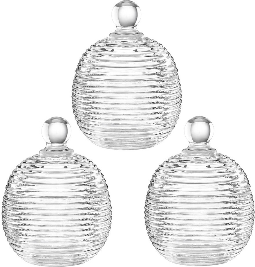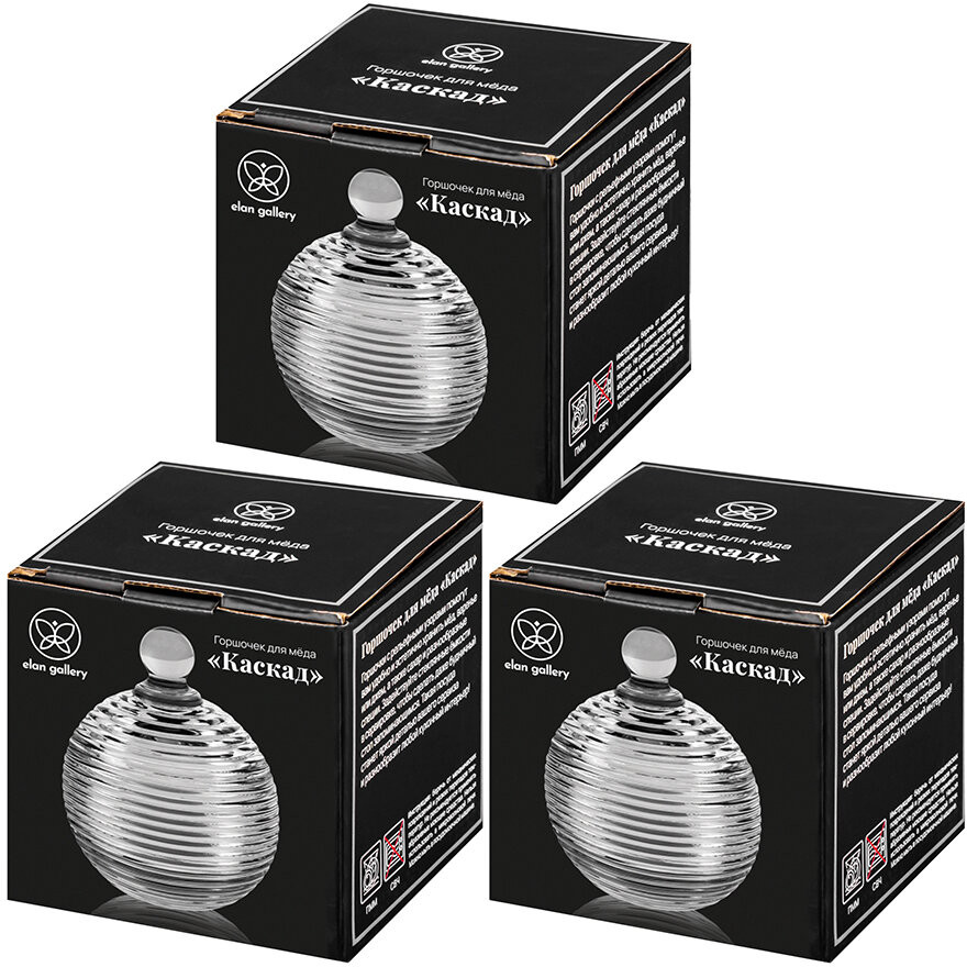 Набор 3 горшочков для мёда Elan Gallery «Каскад» с крышками выполнен из стекла и украшен декоративным рельефным узором в виде горизонтальных полосок. Размер каждого изделия — 8.2×8.2×11 см, объём — 150 мл. Высота без крышки — 5.2 см. Прозрачная баночка с полосатым рельефом подойдёт для хранения мёда, варенья, сахара и соли. Можно использовать её как ёмкость для чая, кофе и других сыпучих продуктов. Декоративная баночка круглой формы станет гармоничным дополнением при сервировке вашего стола как в будни, так и на праздник. Красивый дизайн позволит использовать её не только для хранения продуктов, но и для подачи на стол. Положите в неё конфеты или икру, чтобы удивить гостей изящной сервировкой.