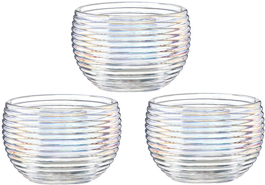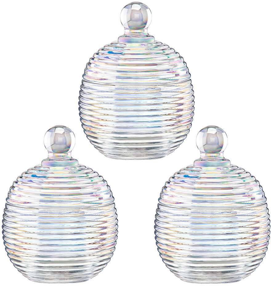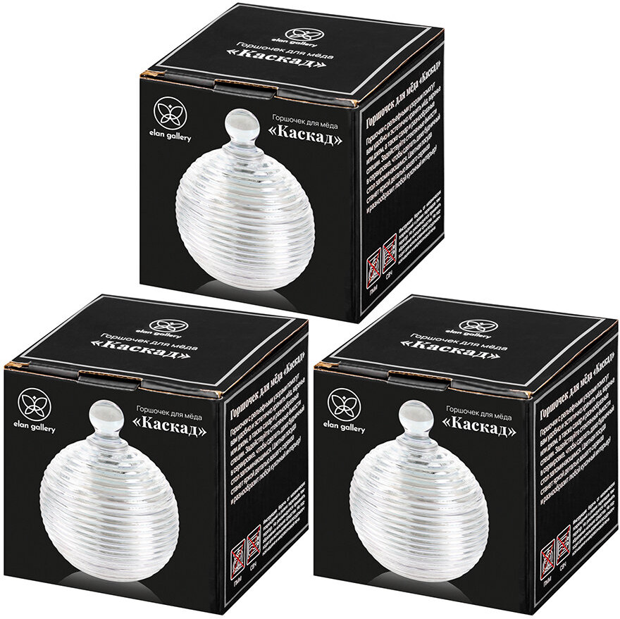 Набор 3 горшочков для мёда Elan Gallery «Каскад» с крышками выполнен из стекла и украшен декоративными рельефными узорами в виде горизонтальных полосок. Размер каждого изделия — 8.2×8.2×11 см, объём — 150 мл. Высота без крышки — 5.2 см. Прозрачная баночка с полосатым рельефом и перламутровым сиянием подойдёт для хранения мёда, варенья, сахара и соли. Можно использовать её как ёмкость для чая, кофе и других сыпучих продуктов. Декоративная баночка круглой формы станет гармоничным дополнением при сервировке вашего стола как в будни, так и на праздник. Красивый дизайн позволит использовать её не только для хранения продуктов, но и для подачи на стол. Положите в неё конфеты или икру, чтобы удивить гостей изящной сервировкой.