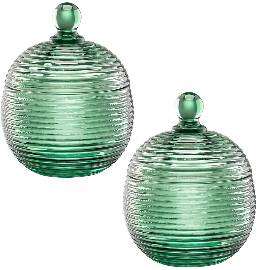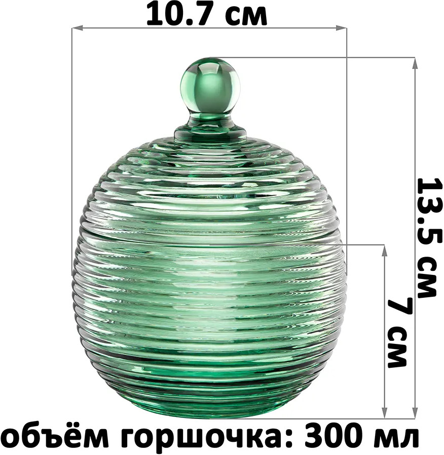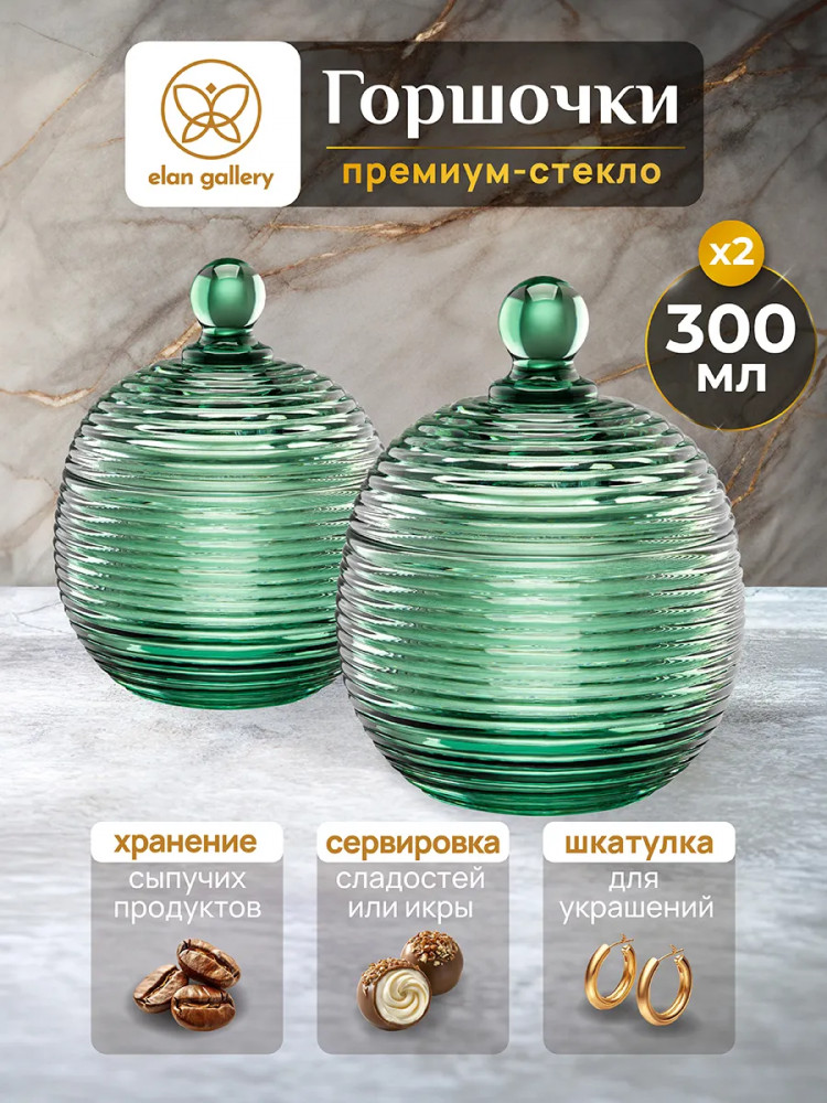 Набор 2 горшочков для мёда Elan Gallery «Каскад» с крышками выполнен из стекла и украшен декоративным рельефным узором в виде горизонтальных полосок. Размер изделия — 10.7×10.7×13.5 см, объём — 300 мл. Высота без крышки — 7 см.Баночка зелёного цвета с полосатым рельефом подойдёт для хранения мёда, варенья, сахара и соли. Можно использовать её как ёмкость для чая, кофе и других сыпучих продуктов. Декоративная баночка круглой формы станет гармоничным дополнением при сервировке вашего стола как в будни, так и на праздник. Красивый дизайн позволит использовать её не только для хранения продуктов, но и для подачи на стол. Положите в неё конфеты или икру, чтобы удивить гостей изящной сервировкой.
