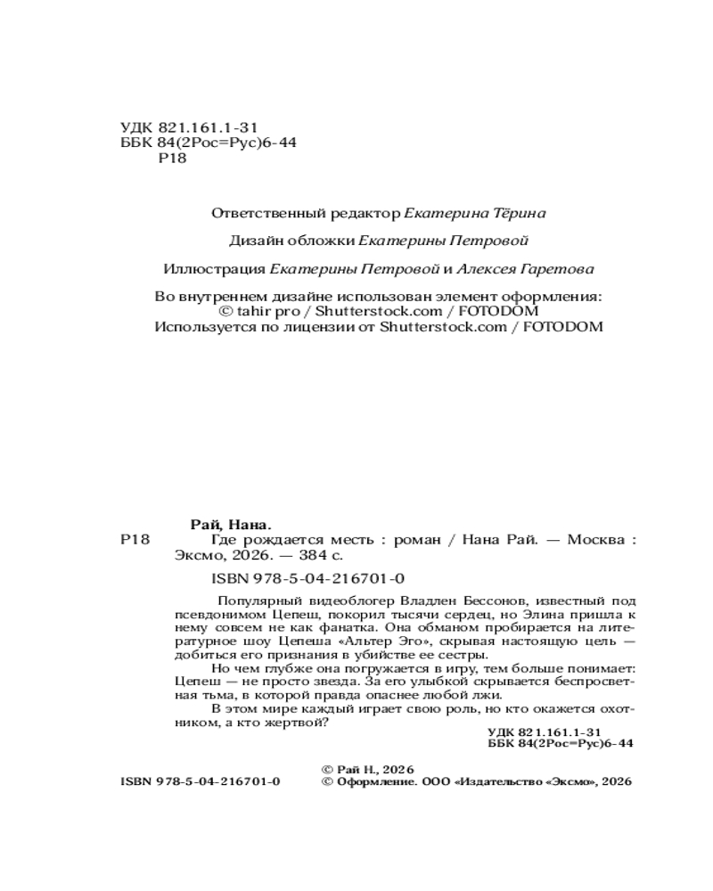 💳 Оплатить за товар можно при получении 🇰🇿 Есть бесплатная доставка по Казахстану от 1 дня 🎁 Копите бонусы с каждой покупки Серия: Психологические игры. Детективный триллер Популярный видеоблогер Владлен Бессонов, известный под псевдонимом Цепеш, покорил тысячи сердец, но Элина пришла к нему совсем не как фанатка. Она обманом пробирается на литературное шоу Цепеша «Альтер Эго», скрывая настоящую цель — добиться его признания в убийстве своей сестры. Но чем глубже она погружается в игру, тем больше понимает: Цепеш — не просто звезда. За его улыбкой скрывается беспросветная тьма, в которой правда опаснее любой лжи. В этом мире каждый играет свою роль, но кто окажется охотником, а кто жертвой? |