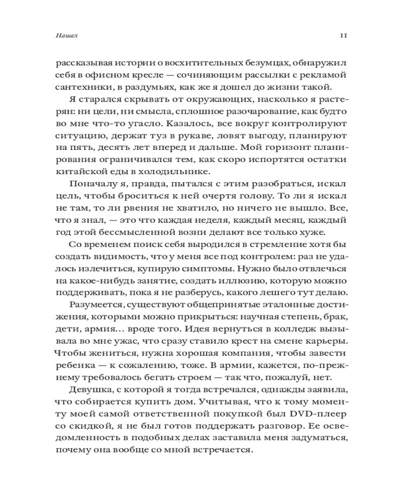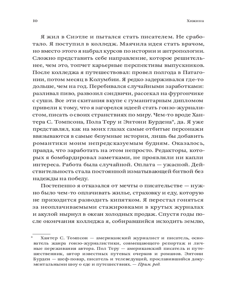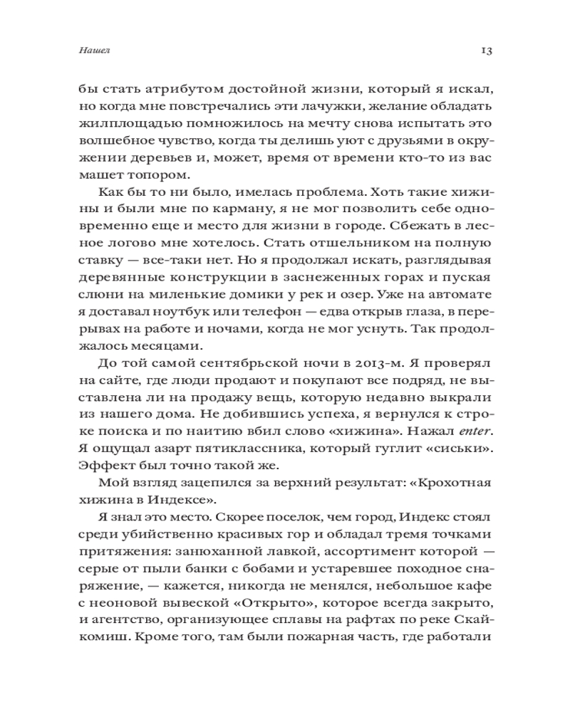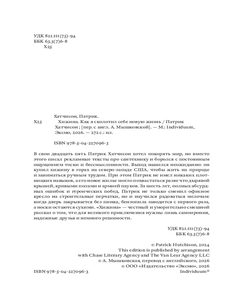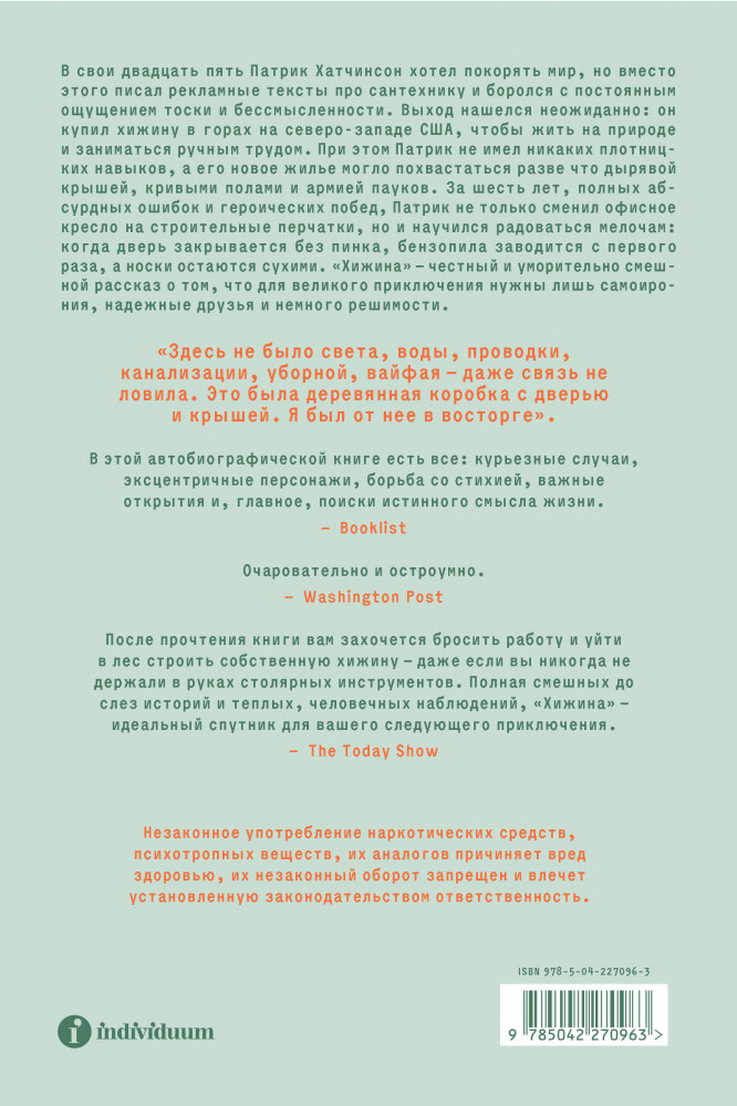 💳 Оплатить за товар можно при получении 🇰🇿 Есть бесплатная доставка по Казахстану от 1 дня 🎁 Копите бонусы с каждой покупки Серия: Individuum В свои двадцать пять Патрик Хатчисон хотел покорять мир, но вместо этого писал рекламные тексты про сантехнику и боролся с постоянным ощущением тоски и бессмысленности. Выход нашелся неожиданно: он купил хижину в горах на северо-западе США, чтобы жить на природе и заниматься ручным трудом. При этом Патрик не имел никаких плотницких навыков, а его новое жилье могло похвастаться разве что дырявой крышей, кривыми полами и армией пауков. За шесть лет, полных абсурдных ошибок и героических побед, Патрик не только сменил офисное кресло на строительные перчатки, но и научился радоваться мелочам: когда дверь закрывается без пинка, бензопила заводится с первого раза, а носки остаются сухими. «Хижина» — честный и уморительно смешной рассказ о том, что для великого приключения нужны лишь самоирония, надежные друзья и немного решимости. |