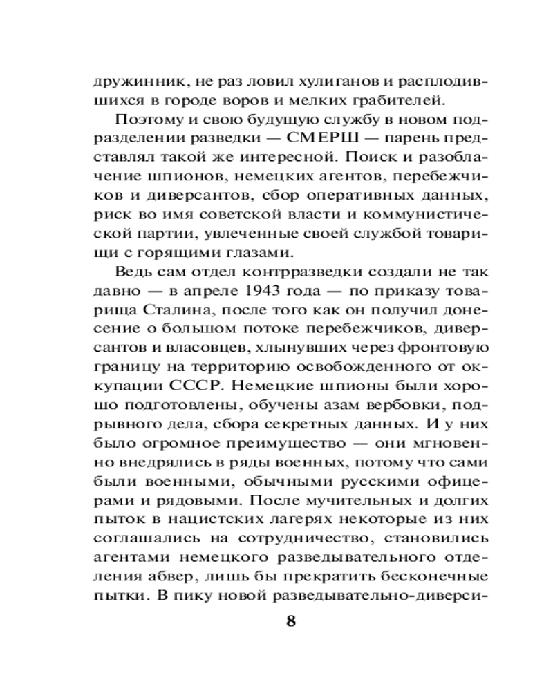 💳 Оплатить за товар можно при получении 🇰🇿 Есть бесплатная доставка по Казахстану от 1 дня 🎁 Копите бонусы с каждой покупки Серия: Смерш — спецназ Сталина Младший лейтенант СМЕРШа Алексей Савельев получает назначение в прифронтовую зону, где действует банда, оставшаяся после отступления гитлеровцев. По данным местного отдела НКВД, логово недобитков устроено на старой мельнице. Решено провести рейд и ликвидировать противника. Савельеву приказано прикрывать товарищей, которые должны первыми ворваться на мельницу. Однако в последний момент операция срывается: мельница оказывается заминированной, многие чекисты погибают. Похоже, врага кто-то успел предупредить. Подозрение падает на Алексея, как на нового в этих краях человека... Молодому офицеру не остается ничего другого, как самостоятельно выявить и обезвредить настоящего предателя... |