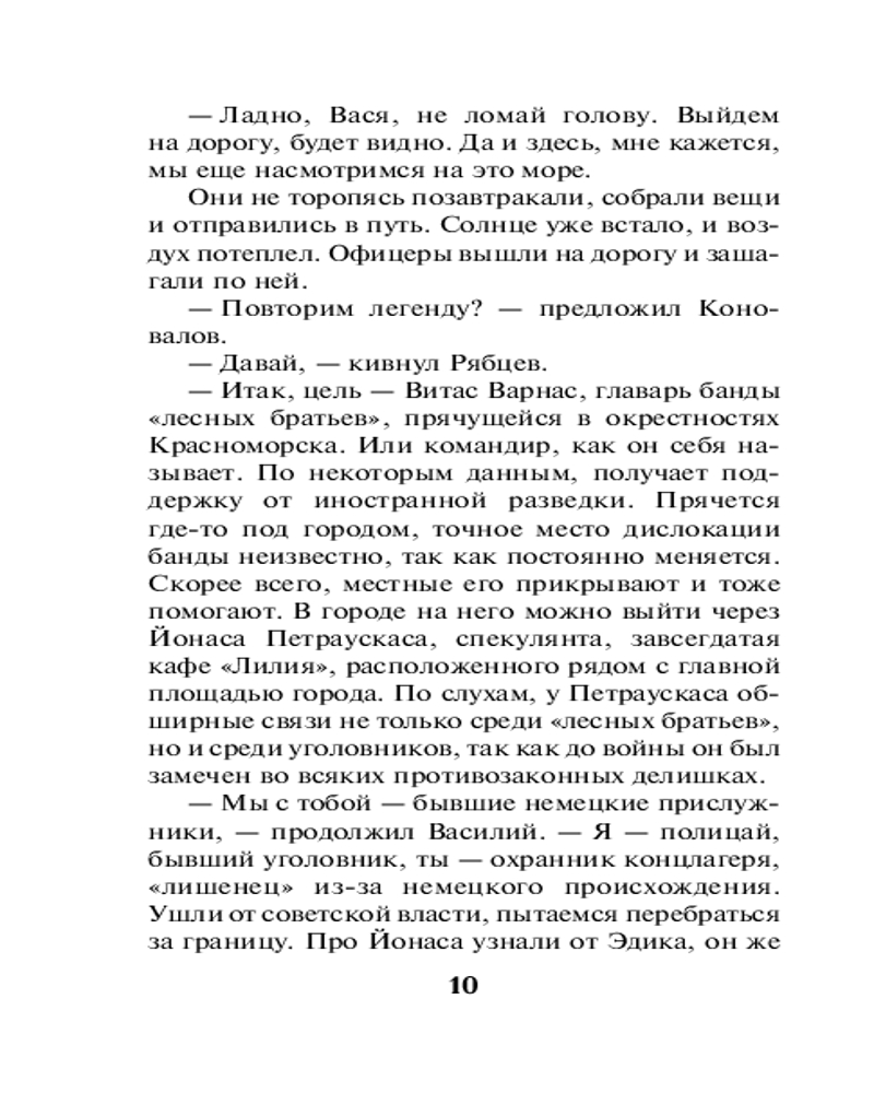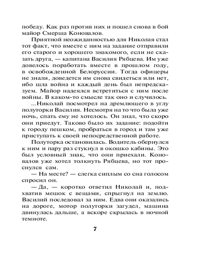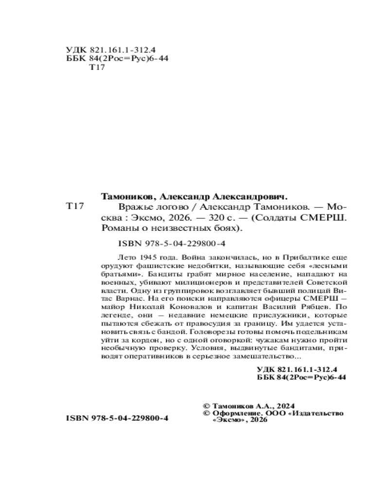 💳 Оплатить за товар можно при получении 🇰🇿 Есть бесплатная доставка по Казахстану от 1 дня 🎁 Копите бонусы с каждой покупки Серия: Солдаты СМЕРШ. Романы о неизвестных боях (обложка) Лето 1945 года. Война закончилась, но в Прибалтике еще орудуют фашистские недобитки, называющие себя «лесными братьями». Бандиты грабят мирное население, нападают на военных, убивают милиционеров и представителей советской власти. Одну из группировок возглавляет бывший полицай Витас Варнас. На его поиски направляются офицеры СМЕРШа — майор Николай Коновалов и капитан Василий Рябцев. По легенде они — недавние немецкие прислужники, которые пытаются сбежать от правосудия за границу. Им удается установить связь с бандой. Головорезы готовы помочь подельникам уйти за кордон, но с одной оговоркой: чужакам нужно пройти необычную проверку. Условия, выдвинутые бандитами, приводят оперативников в серьезное замешательство... |