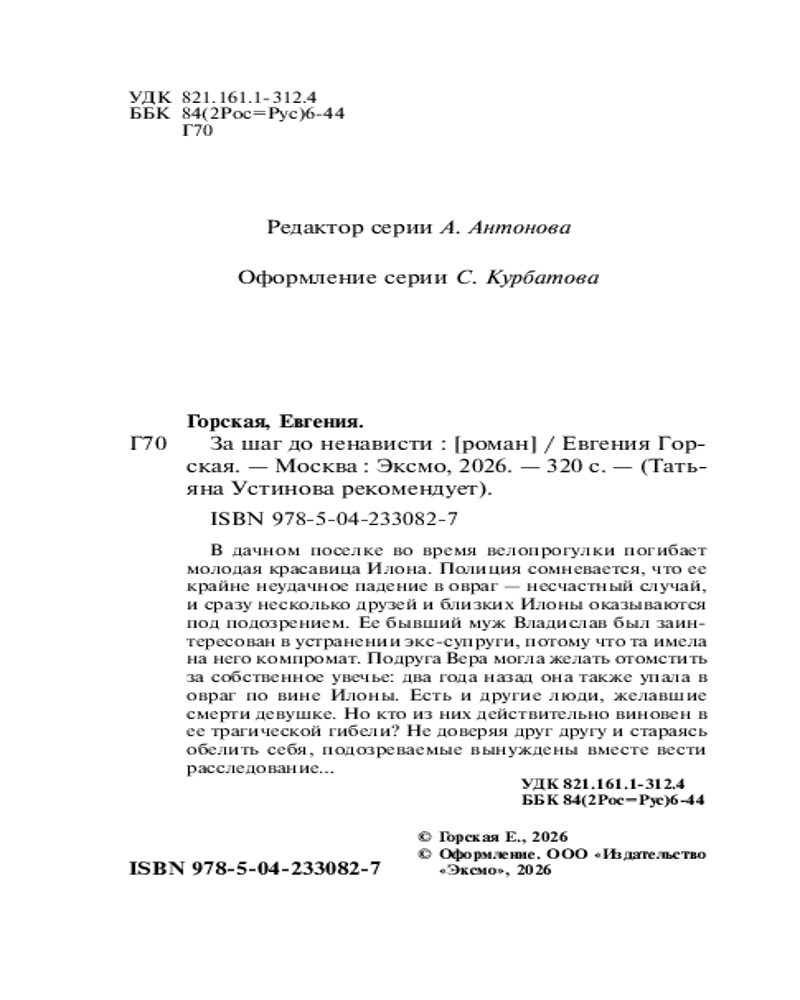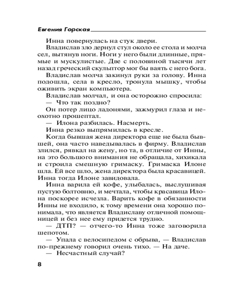 💳 Оплатить за товар можно при получении 🇰🇿 Есть бесплатная доставка по Казахстану от 1 дня 🎁 Копите бонусы с каждой покупки Серия: Татьяна Устинова рекомендует (обложка) В дачном поселке во время велопрогулки погибает молодая красавица Илона. Полиция сомневается, что ее крайне неудачное падение в овраг — несчастный случай, и сразу несколько друзей и близких Илоны оказываются под подозрением. Ее бывший муж Владислав был заинтересован в устранении экс-супруги, потому что та имела на него компромат. Подруга Вера могла желать отомстить за собственное увечье: два года назад она так же упала в овраг по вине Илоны. Есть и другие люди, желавшие смерти девушке, но кто из них действительно виновен в ее трагической гибели? Не доверяя друг другу и стараясь обелить себя, подозреваемые вынуждены вместе вести расследование... |