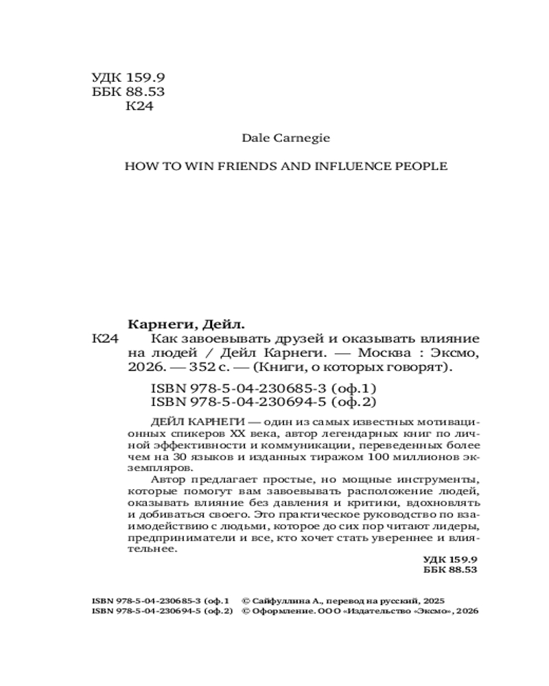💳 Оплатить за товар можно при получении 🇰🇿 Есть бесплатная доставка по Казахстану от 1 дня 🎁 Копите бонусы с каждой покупки Серия: Книги, о которых говорят Дейл Карнеги — один из самых влиятельных мотивационных спикеров XX века, автор легендарных книг по личной эффективности и коммуникации, переведенных более чем на 30 языков и изданных общим тиражом свыше 100 миллионов экземпляров. Его принципы просты, но удивительно действенны. Они помогают завоевывать доверие, вдохновлять людей, влиять без давления и критики, строить отношения, основанные на уважении и взаимопонимании. Эта книга — практическое руководство по взаимодействию с людьми, которое до сих пор читают лидеры, предприниматели и все, кто хочет стать увереннее, убедительнее и успешнее. |