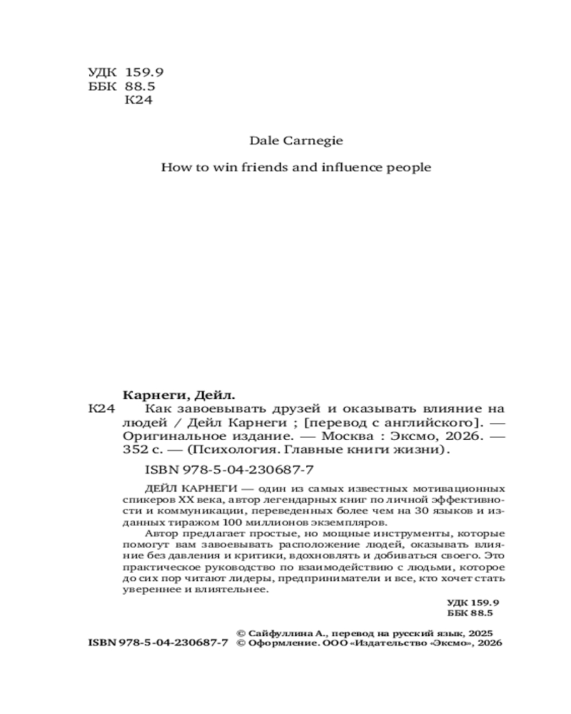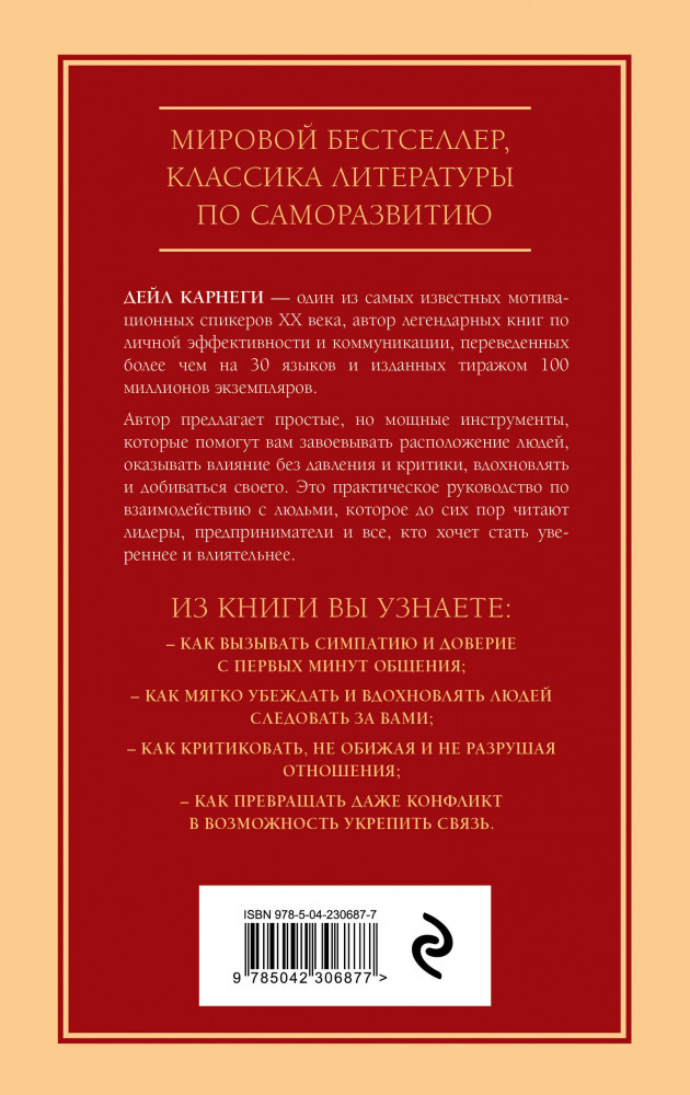 💳 Оплатить за товар можно при получении 🇰🇿 Есть бесплатная доставка по Казахстану от 1 дня 🎁 Копите бонусы с каждой покупки Серия: Психология. Главные книги жизни Дейл Карнеги — один из самых известных мотивационных спикеров XX века, автор легендарных книг по личной эффективности и коммуникации, переведенных более чем на 30 языков и изданных тиражом 100 миллионов экземпляров. Автор предлагает простые, но мощные инструменты, которые помогут вам завоевывать расположение людей, оказывать влияние без давления и критики, вдохновлять и добиваться своего. Это практическое руководство по взаимодействию с людьми, которое до сих пор читают лидеры, предприниматели и все, кто хочет стать увереннее и влиятельнее. |