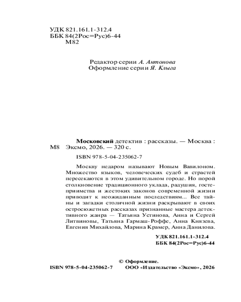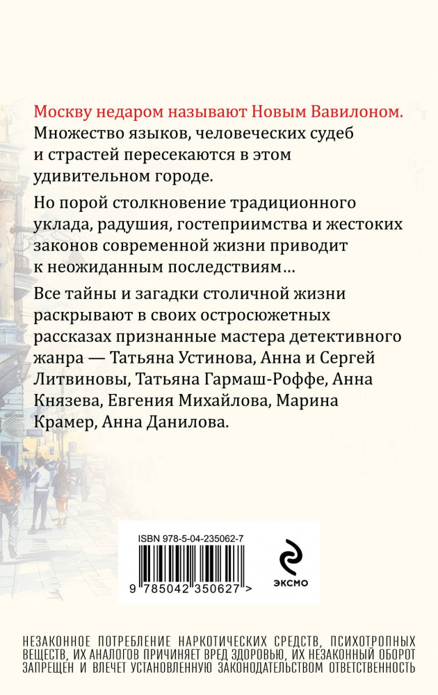💳 Оплатить за товар можно при получении 🇰🇿 Есть бесплатная доставка по Казахстану от 1 дня 🎁 Копите бонусы с каждой покупки Серия: Столичный детектив. Новое оформление (обложка) Москву недаром называют Новым Вавилоном. Множество языков, человеческих судеб и страстей пересекаются в этом удивительном городе. Но порой столкновение традиционного уклада, радушия, гостеприимства и жестоких законов современной жизни приводит к неожиданным последствиям... Все тайны и загадки столичной жизни раскрывают в своих остросюжетных рассказах признанные мастера детективного жанра — Татьяна Устинова, Анна и Сергей Литвиновы, Татьяна Гармаш-Роффе, Анна Князева, Евгения Михайлова, Марина Крамер, Анна Данилова. |