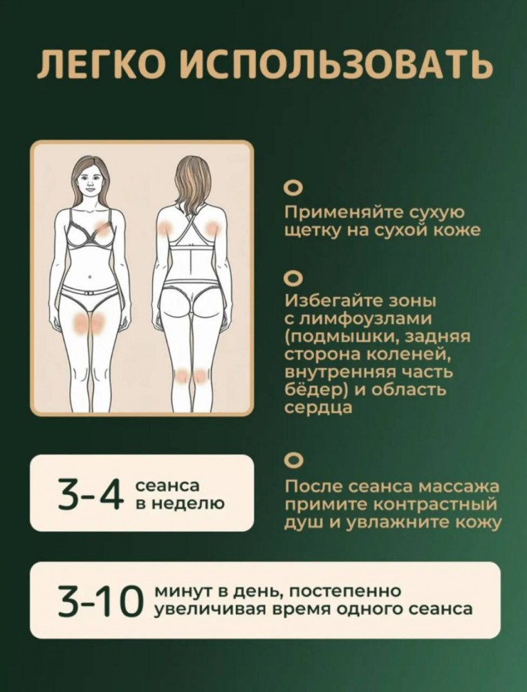💳 Оплатить за товар можно при получении 🇰🇿 Есть бесплатная доставка по Казахстану от 1 дня 🎁 Копите бонусы с каждой покупки Щетка предназначена для эффективного сухого массажа, который помогает бороться с целлюлитом и улучшает состояние кожи. Регулярное использование обеспечивает видимый эффект уже через 10 минут в день, делая кожу более гладкой и упругой. |
