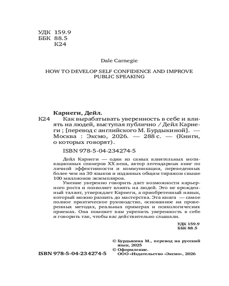 💳 Оплатить за товар можно при получении 🇰🇿 Есть бесплатная доставка по Казахстану от 1 дня 🎁 Копите бонусы с каждой покупки Серия: Книги, о которых говорят Дейл Карнеги — один из самых влиятельных мотивационных спикеров XX века, автор легендарных книг по личной эффективности и коммуникации, переведенных более чем на 30 языков и изданных общим тиражом свыше 100 миллионов экземпляров. Умение уверенно говорить дает возможности карьерного роста и позволяет влиять на людей. Это не врожденный талант, утверждает Карнеги, а приобретенный навык, который можно развить до мастерства. Эта книга — самое полное практическое руководство, основанное на проверенных методах, реальных примерах и психологических приемах. Она поможет вам укрепить уверенность в себе и говорить так, чтобы вас действительно слышали. |