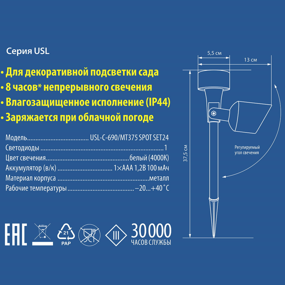 💳 Оплатить за товар можно при получении 🇰🇿 Есть бесплатная доставка по Казахстану от 1 дня 🎁 Копите бонусы с каждой покупки Грунтовый светильник светодиодный на солнечных батареях USL-C-690/MT375 SPOT SET24 от китайского производителя Uniel будет отлично смотреться в саду в современном стиле. Светильник имеет 1 плафон из серого металла с цоколем 1xLED. Лампочки имеют белый оттенок свечения. Срок службы составит не менее 30000 часов. |