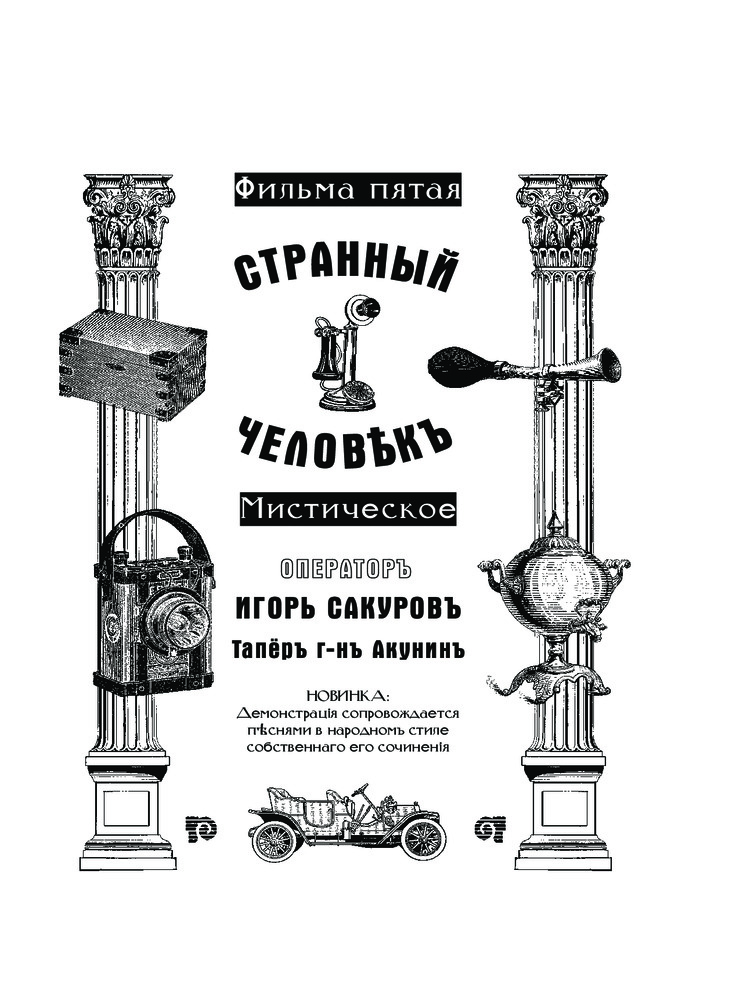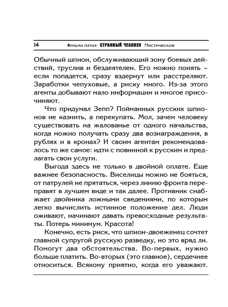 Пятая "фильма" под названием "Странный человек" воссоздает картину России 1915-16 годов. Автор, как всегда, внимателен к историческим деталям, рассматривая известные исторические фигуры (Распутин). Интересно было узнать, что накануне 1 мировой войны германская разведка была лучшей в мире. Хочется дальше узнать, чем закончится противостояние немецкой и русской разведок. Но ранние книги Б.Акунина были лучше.