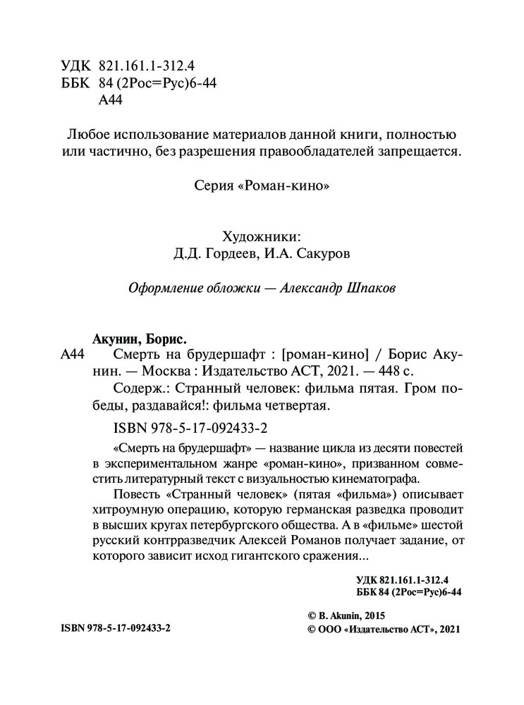 В данный момент этот товар отсутствует в продаже. Возможно, у нас найдется аналогичный или похожий товар здесь. Серия: Роман-кино «Смерть на брудершафт» — название цикла из десяти повестей в экспериментальном жанре «роман-кино», призванном совместить литературный текст с визуальностью кинематографа.