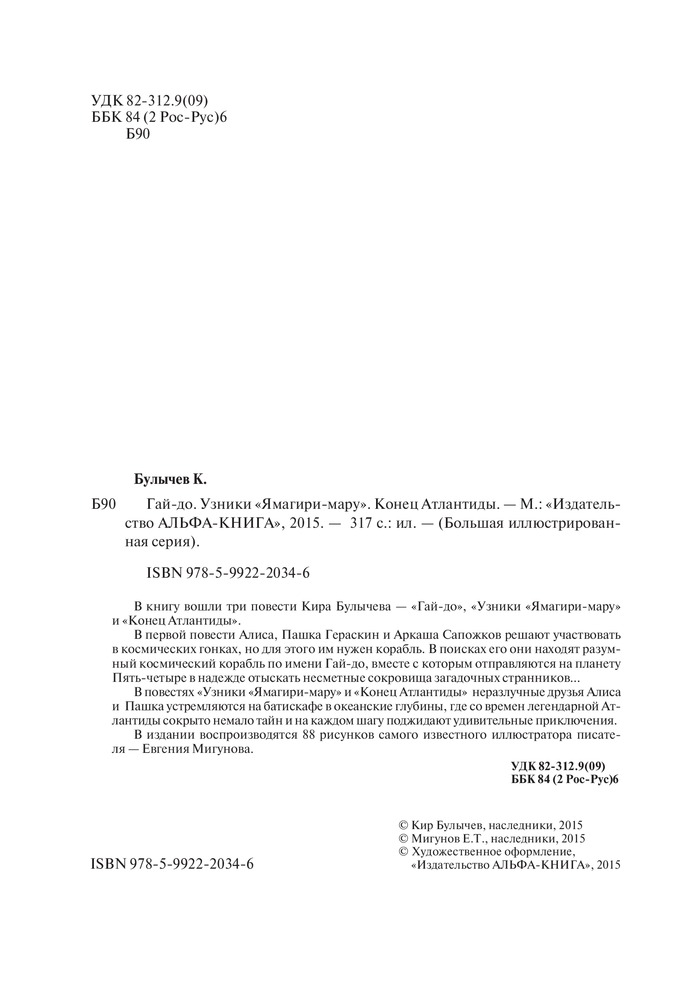 В данный момент этот товар отсутствует в продаже. Возможно, у нас найдется аналогичный или похожий товар здесь. Серия: Большая иллюстрированная серия В книгу вошли три повести Кира Булычева — «Гай-до», «Узники «Ямагири-мару» и «Конец Атлантиды».