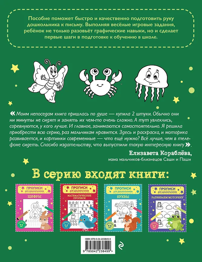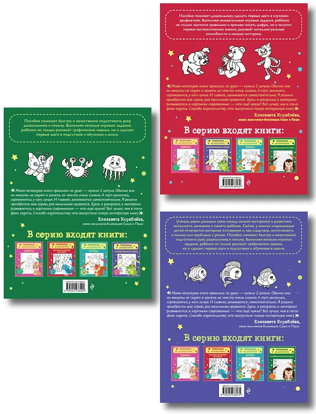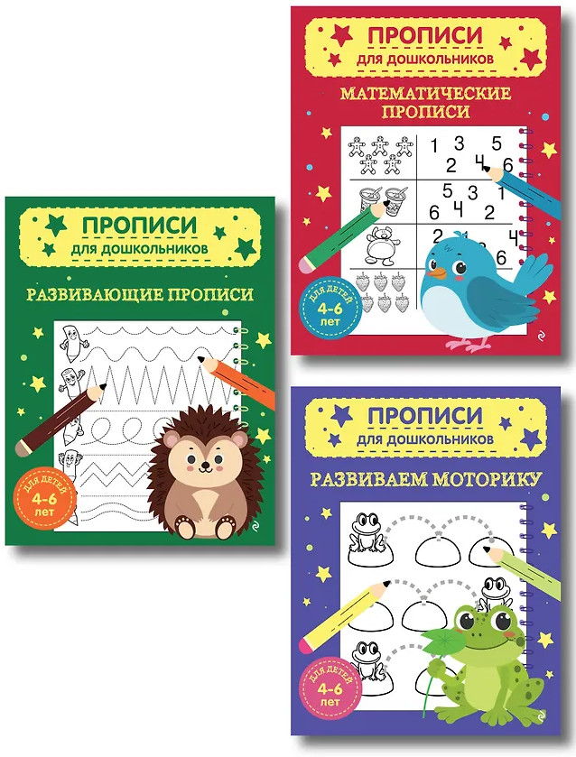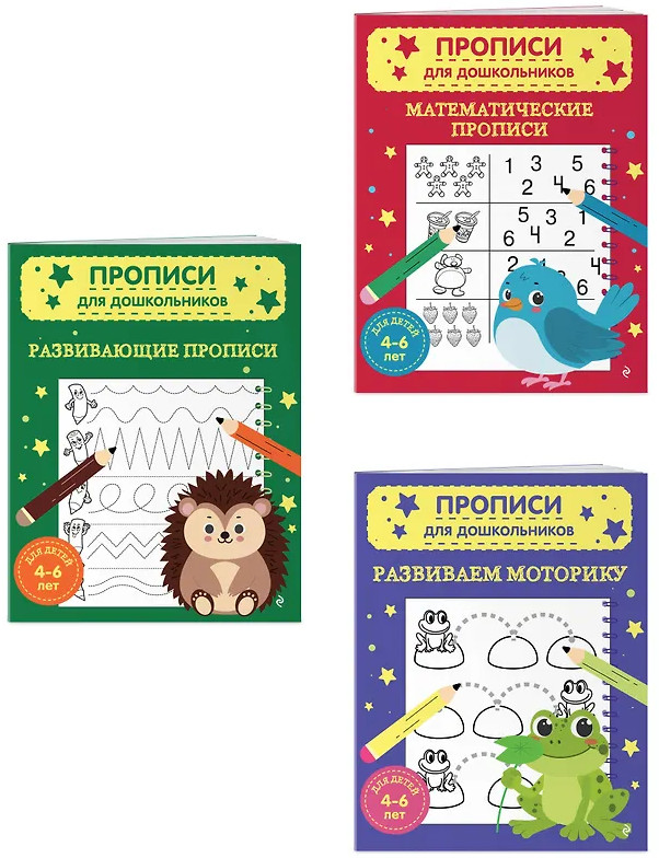 💳 Оплатить за товар можно при получении 🇰🇿 Есть бесплатная доставка по Казахстану от 1 дня 🎁 Копите бонусы с каждой покупки Серия: Прописи для дошкольников Комплект из трех развивающих тетрадей для детей 4, 5, 6 лет от издательства «Эксмо» — это настоящая находка для родителей будущих первоклассников при подготовке к школе. Пособия соответствуют ФГОС, четко структурированы и помогут быстро и надежно подготовить руку к письму. Ребенок тренирует аккуратность и усидчивость, концентрацию и внимание в игре: обводит по пунктиру и узнает разные типы линий, проходит веселые лабиринты, рисует узоры и картинки по точкам и клеткам, запоминает цифры, соотносит цифру и число, знакомится с математическими символами, штрихует, дорисовывает половинки предметов. Эти книги — обучающие раскраски с крупными картинками! |