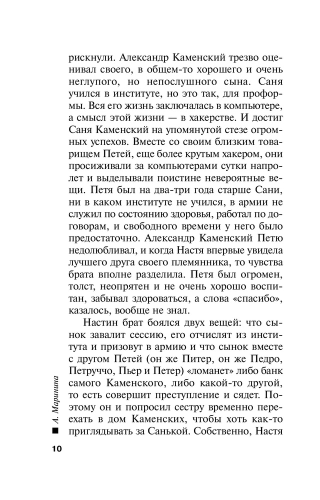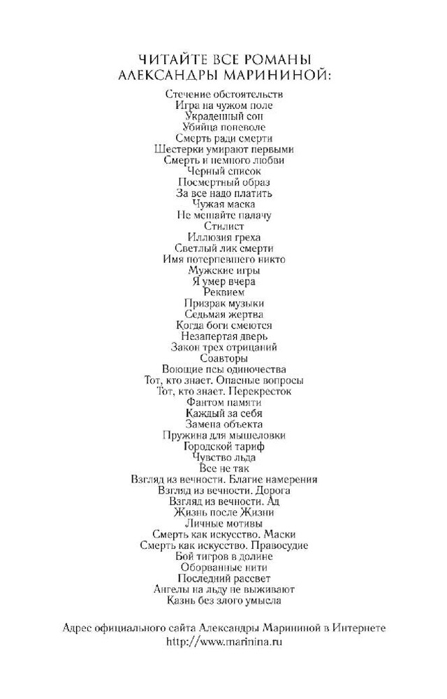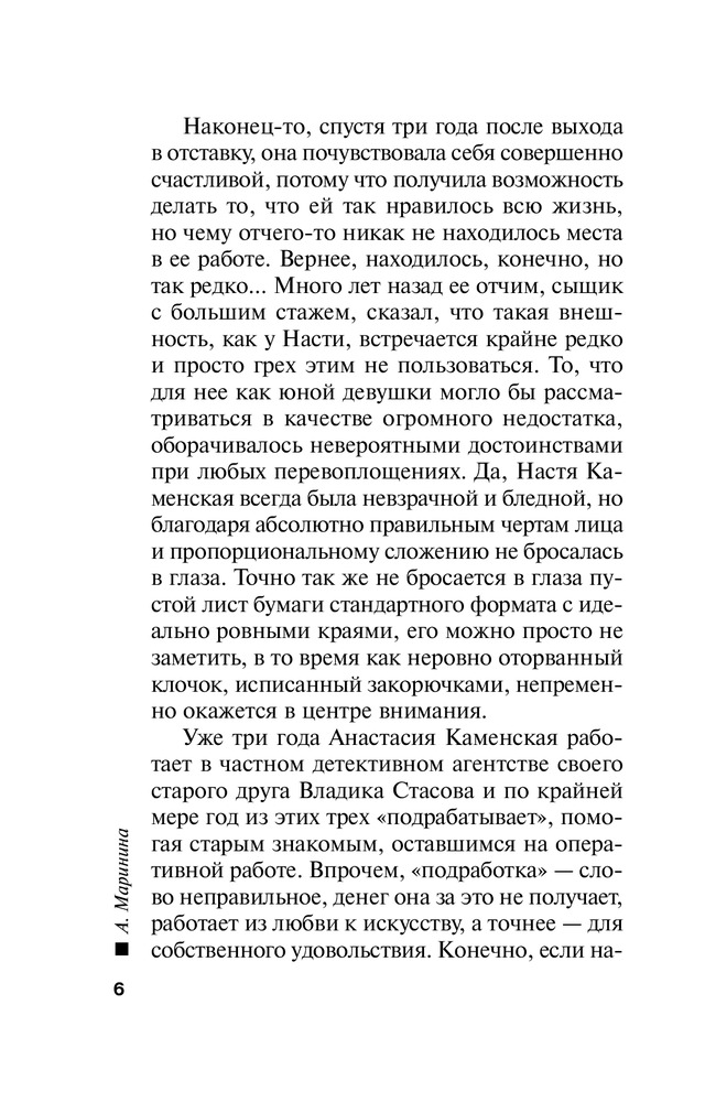 Александра Маринина (настоящее имя — Марина Анатольевна Алексеева) — российская писательница, автор произведений детективного жанра. Родилась во Львове, жила в Ленинграде, позднее переехала в Москву. Окончила юридический факультет МГУ и получила распределение в Академию МВД СССР. Карьеру в органах начала с должности лаборанта, затем была назначена на должность научного сотрудника и получила звание лейтенанта милиции. Занималась изучением личности преступника с аномалиями психики,... |