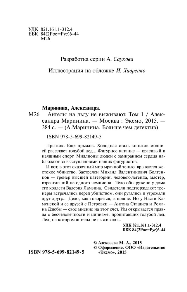 В данный момент этот товар отсутствует в продаже. Возможно, у нас найдется аналогичный или похожий товар здесь. Серия: А. Маринина. Больше чем детектив (обложка) «Прыжок. Еще прыжок. Холодная сталь коньков молнией рассекает голубой лед… Фигурное катание — красивый и изящный спорт. Миллионы людей с замиранием сердца внимают выступлениям наших фигуристов.