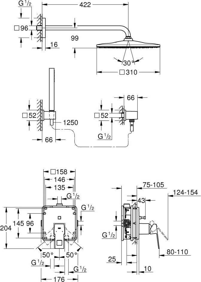 Верхний душ с душевым кронштейном Grohe Rainshower Mono 310 Cube, хром (26564000)
