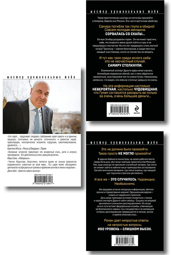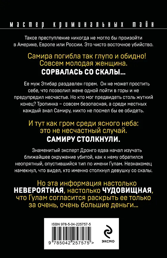Такое преступление никогда не могло бы произойти в Америке, Европе или России. Это чисто восточное убийство. Самира погибла так глупо и обидно! Совсем молодая женщина. Сорвалась со скалы... Ее муж Этибар раздавлен горем. Он не может простить себе, что позволил жене одной пойти в горы и не предупредил несчастье. Но кто мог предвидеть столь жуткий конец? Тропинка — совсем безопасная, а среди местных каждый знал Самиру, никто не посмел бы ее обидеть. И тут как гром среди ясного неба: это не несчастный случай. Самиру столкнули. Кроткая, безгрешная, почти святая девушка — за что же так жестоко поступили с ней? Дикая, необъяснимая история. Знаменитый эксперт Дронго едва начал изучать ближайшее окружение убитой, как к нему обратился неопрятный опустившийся тип по имени Гулам. Незнакомец намекнул, что видел, кто именно столкнул девушку со скалы. Но эта информация настолько невероятная, настолько чудовищная, что Гулам согласится раскрыть ее только за очень, очень большие деньги...