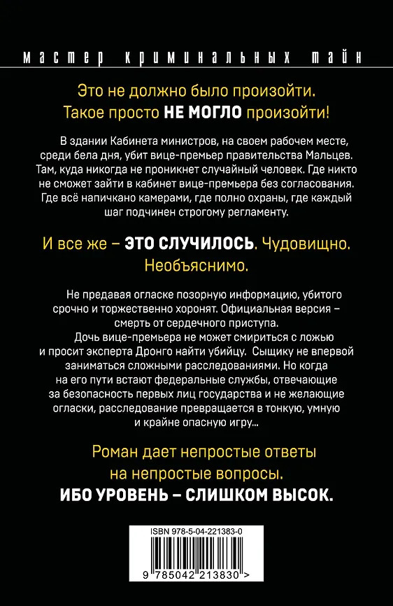 Знаменитый эксперт Дронго расследует преступление там, где государственные тайны хранят, как нигде в мире. Это не должно было произойти. Такое просто не могло произойти! В здании кабинета министров, на своем рабочем месте, среди бела дня, убит вице-премьер правительства Мальцев. Там, куда никогда не проникнет случайный человек. Где никто не сможет зайти в кабинет вице-премьера без согласования. Где всё напичкано камерами, где полно охраны, где каждый шаг подчинен строгому регламенту. И все же — это случилось. Чудовищно. Необъяснимо. Не предавая огласке позорную информацию, убитого срочно и торжественно хоронят. Официальная версия — смерть от сердечного приступа. Дочь вице-премьера не может смириться с ложью и просит эксперта Дронго найти убийцу. Сыщику не впервой заниматься сложными расследованиями. Но когда на его пути встают федеральные службы, отвечающие за безопасность первых лиц государства и не желающие огласки, то расследование превращается в тонкую, умную и крайне опасную игру... |