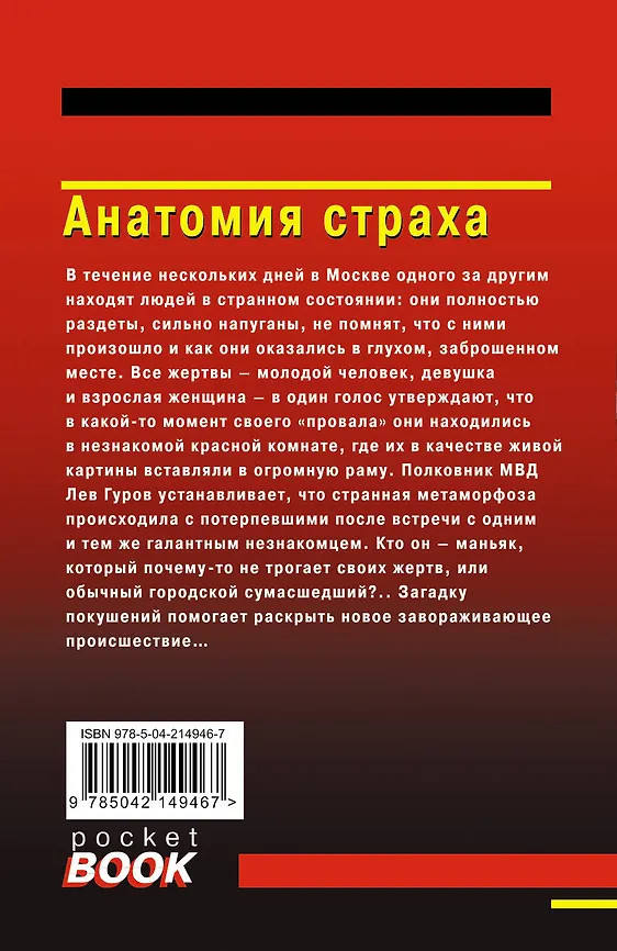 В течение нескольких дней в Москве одного за другим находят людей в странном состоянии: они полностью раздеты, сильно напуганы, не помнят, что с ними произошло и как они оказались в глухом заброшенном месте. Все жертвы — молодой человек, девушка и взрослая женщина — в один голос утверждают, что в какой-то момент своего «провала» они находились в незнакомой красной комнате, где их в качестве живой картины вставляли в огромную раму. Полковник МВД Лев Гуров устанавливает, что странная метаморфоза происходила с потерпевшими после встречи с одним и тем же галантным незнакомцем. Кто он — маньяк, который почему-то не трогает своих жертв, или обычный городской сумасшедший?.. Загадку покушений помогает раскрыть новое завораживающее происшествие...