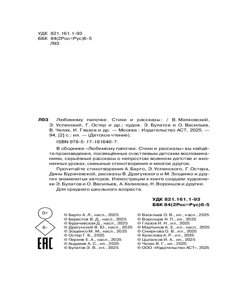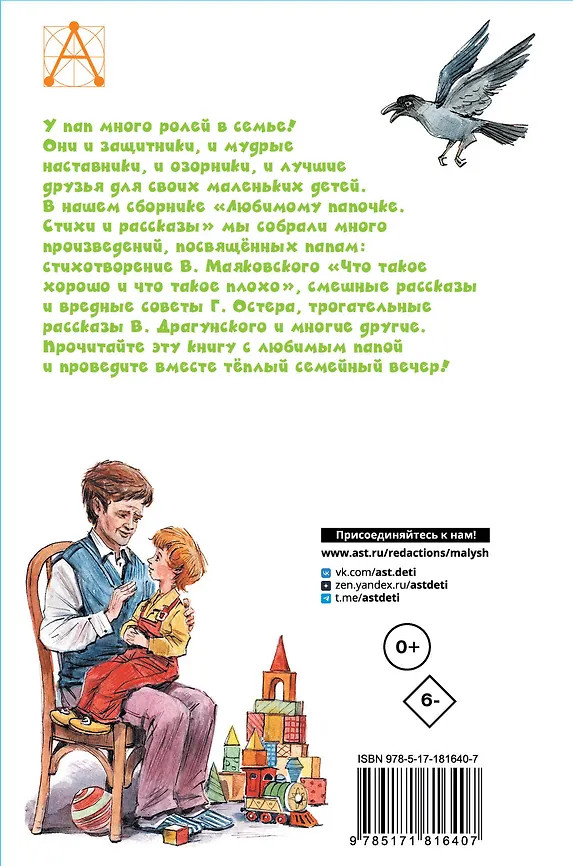 💳 Оплатить за товар можно при получении 🇰🇿 Есть бесплатная доставка по Казахстану от 1 дня 🎁 Копите бонусы с каждой покупки Серия: Детское чтение В сборнике «Любимому папочке. Стихи и рассказы» вы найдёте произведения, посвящённые счастливым детским воспоминаниям, серьёзные рассказы о непростом военном детстве и жизненных уроках, смешные стихотворения и многое другое. Прочитайте стихотворения А. Барто, Э. Успенского, Г. Остера, Дины Бурачевской, рассказы В. Драгунского и М. Зощенко и других знаменитых авторов. Иллюстрации к книге создали художники Э. Булатов и О. Васильев, А. Халилова, Н. Воронцов и другие. Для среднего школьного возраста. |
