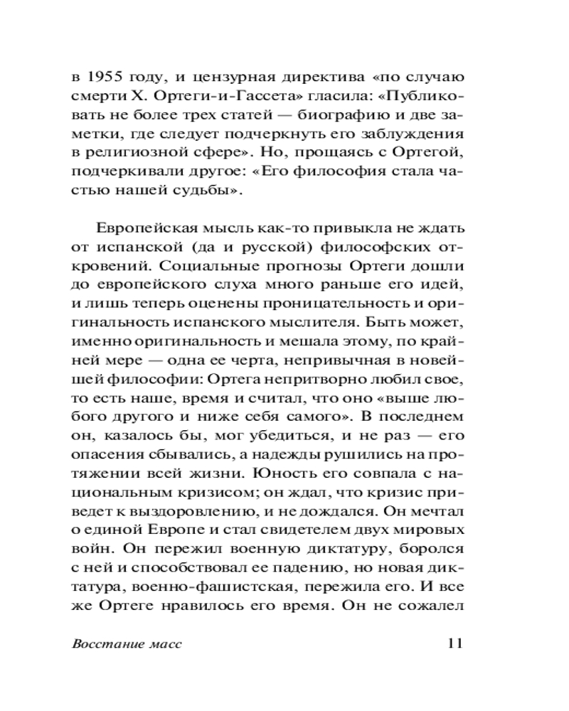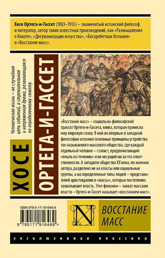 💳 Оплатить за товар можно при получении 🇰🇿 Есть бесплатная доставка по Казахстану от 1 дня 🎁 Копите бонусы с каждой покупки Серия: Эксклюзивная классика «Восстание масс» — социально-философский трактат Ортеги-и-Гассета, книга, которая принесла ему мировую славу. В ней он впервые в западной философии изложил основные принципы устройства так называемого массового общества, где каждый отдельный человек — статист, предпочитающий «плыть по течению» и не несущий ни за что ответственности. А западное общество ХХ века, по мнению автора, разделено не на классы или социальные группы, а на определенные типы людей — представителей аристократии и «массы», которые постепенно захватывают власть. Этот феномен — захват массами власти — Ортега-и-Гассет называет «восстанием масс». |