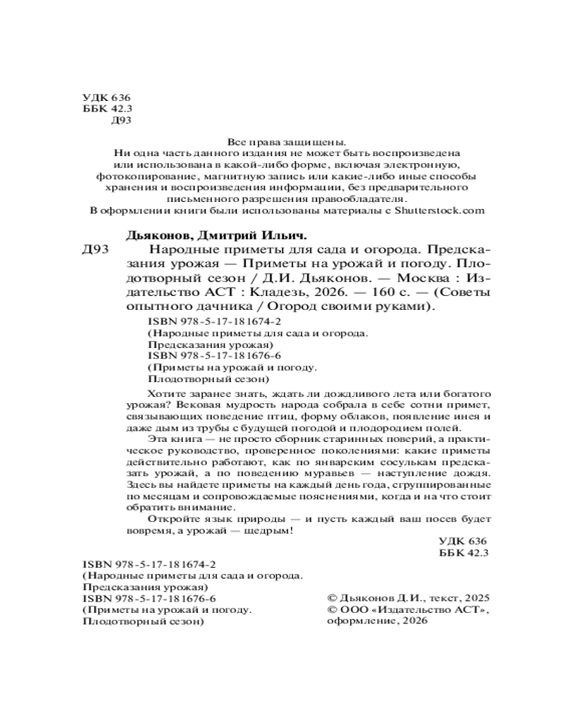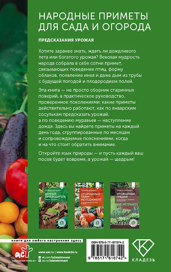 💳 Оплатить за товар можно при получении 🇰🇿 Есть бесплатная доставка по Казахстану от 1 дня 🎁 Копите бонусы с каждой покупки Серия: Советы опытного дачника Хотите заранее знать, ждать ли дождливого лета или богатого урожая? Вековая мудрость народа собрала в себе сотни примет, связывающих поведение птиц, форму облаков, появление инея и даже дым из трубы с будущей погодой и плодородием полей. Эта книга — не просто сборник старинных поверий, а практическое руководство, проверенное поколениями: какие приметы действительно работают, как по январским сосулькам предсказать урожай, а по поведению муравьев — наступление дождя. Здесь вы найдете приметы на каждый день года, сгруппированные по месяцам и сопровождаемые пояснениями, когда и на что стоит обратить внимание. Откройте язык природы — и пусть каждый ваш посев будет вовремя, а урожай — щедрым! |