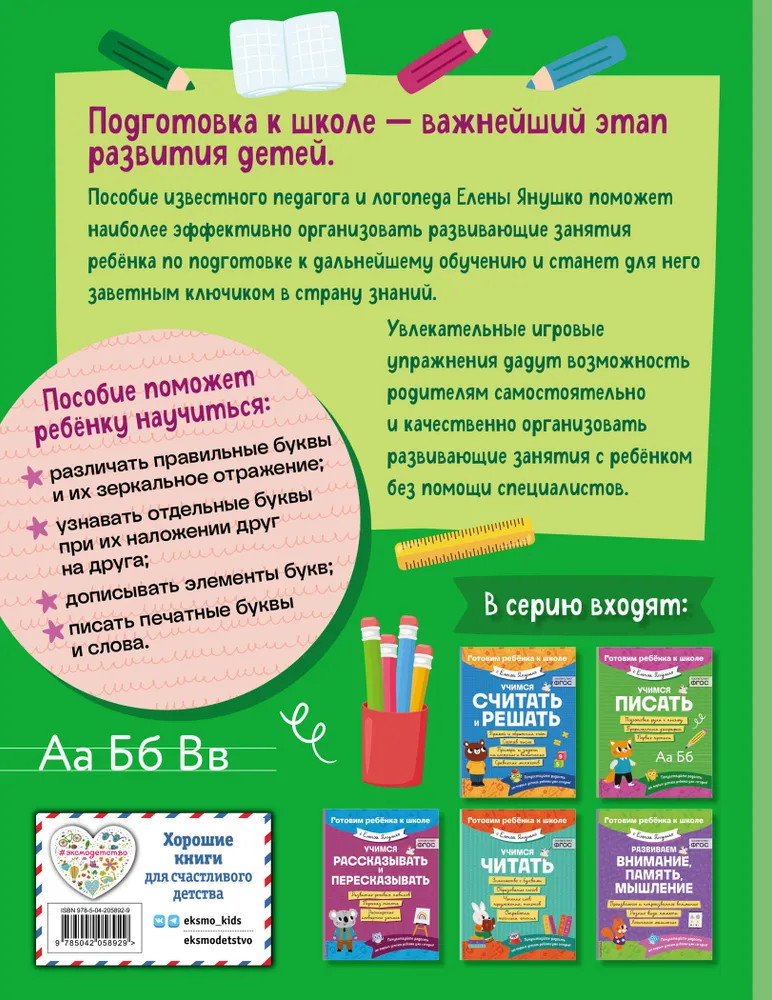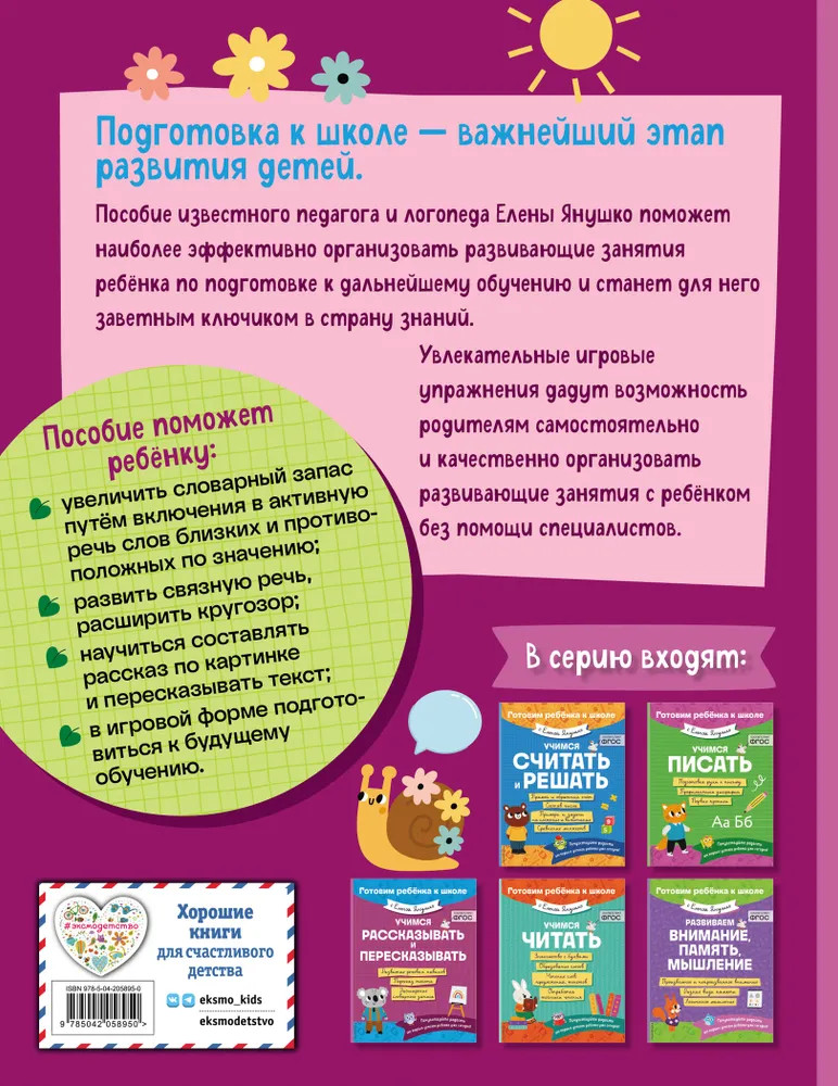 Серия: Готовим ребенка к школе с Еленой Янушко Комплексная подготовка к школе: 5 развивающих книг для детей 4, 5, 6, 7 лет от известного педагога-логопеда Елены Янушко. Дошкольная подготовка — очень важная часть развития дошкольника, которая должна заложить прочную базу для его дальнейшего обучения.
