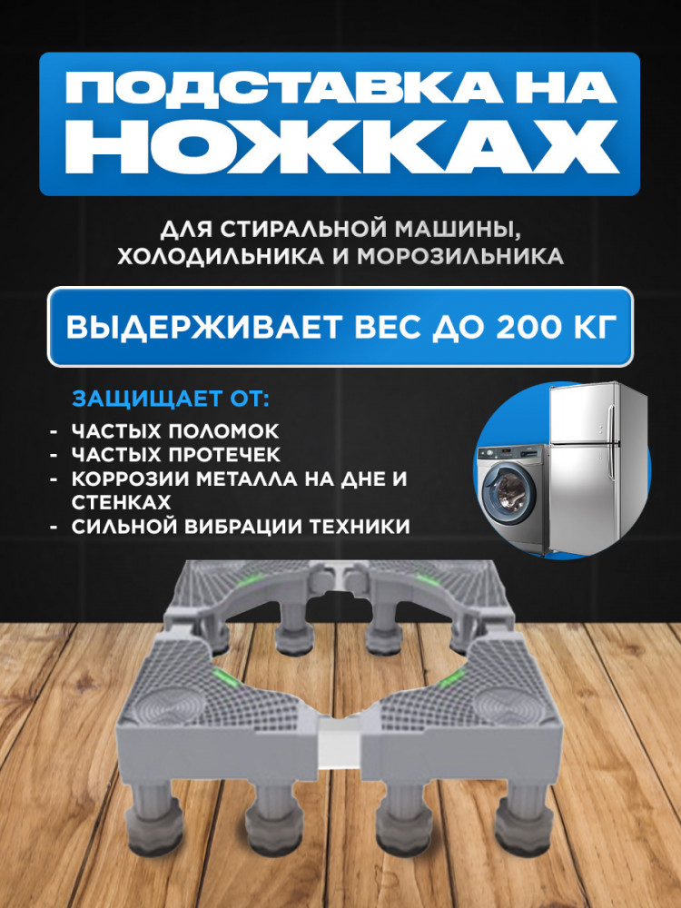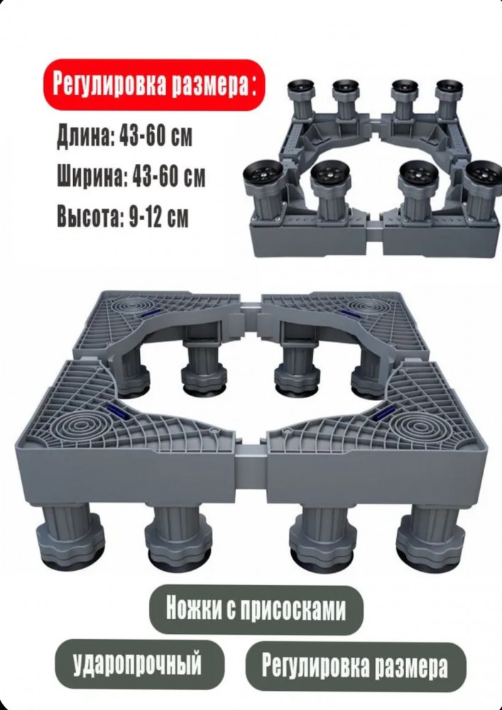 Подставка для мебели и стиральной машины — регулируемая, прочная. Универсальная подставка предназначена для стиральных машин, холодильников, шкафов, тумбочек и другой крупной бытовой техники. Подходит для большинства моделей и размеров. Изготовлена из прочного пластика и усиленных труб, выдерживает большие нагрузки и обеспечивает надёжную устойчивость.