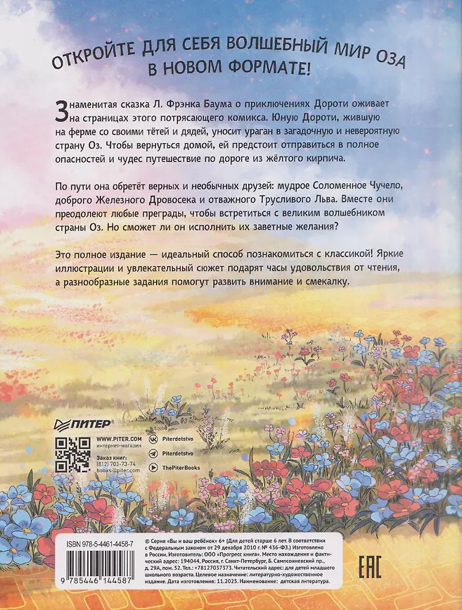 💳 Оплатить за товар можно при получении 🇰🇿 Есть бесплатная доставка по Казахстану от 1 дня 🎁 Копите бонусы с каждой покупки Серия: Вы и ваш ребенок Откройте для себя волшебный мир Оз в новом формате! Знаменитая сказка Л. Фрэнка Баума о приключениях Дороти оживает на страницах этого потрясающего комикса. Юную Дороти, жившую на ферме со своими тётей и дядей, уносит ураган в загадочную и невероятную страну Оз. Чтобы вернуться домой, ей предстоит отправиться в полное опасностей и чудес путешествие по дороге из жёлтого кирпича. |