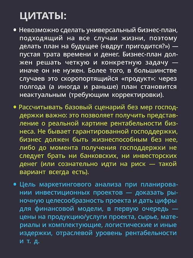 💳 Оплатить за товар можно при получении 🇰🇿 Есть бесплатная доставка по Казахстану от 1 дня 🎁 Копите бонусы с каждой покупки Сборник практических инструментов для создания бизнес-плана. Наличие и качество бизнес-плана напрямую влияют на успех компании, поскольку это эффективный инструмент привлечения финансирования, господдержки и решения иных задач. Бизнес-план — не просто формальный документ, это процесс изучения рынка, финансовых моделей, составления стратегий и графиков. В книге представлены примеры из российской практики, шаблоны, приемы и способы расчетов, которые помогут облегчить планирование для лиц, принимающих решения. Издание поможет разобраться, где взять и как лучше отразить информацию для каждого пункта бизнес-плана. |