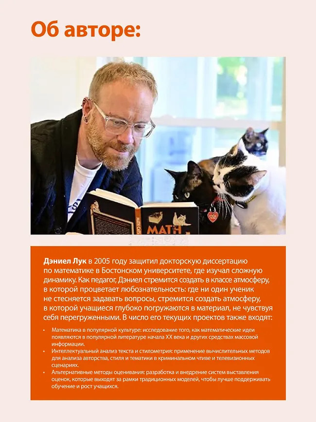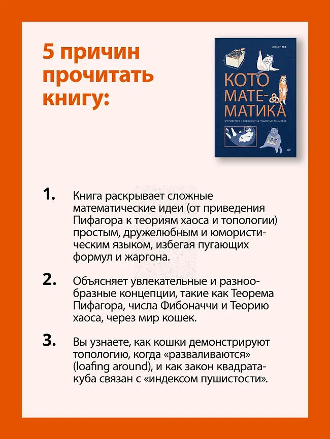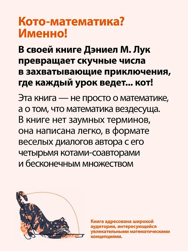 💳 Оплатить за товар можно при получении 🇰🇿 Есть бесплатная доставка по Казахстану от 1 дня 🎁 Копите бонусы с каждой покупки Серия: New Science Кото-математика? Именно! В своей книге Дэниел М. Лук превращает скучные числа в захватывающие приключения, где каждый урок ведет... кот! Изучи теорему Муррфагора и научись вычислять лапотенузу. Узнай, почему не все коты «тупые»! Раздели 5 банок еды на 6 питомцев, используя египетские дроби. Проследи за котами Муррбоначчи, чье потомство и умение сворачиваться в спираль являют нам скрытые законы природы. Заинтригованы? А как насчет золотого сечения, определяющего самого милого кота на свете? Или метода Эйлера, позволяющего пушистым проказникам точно рассчитывать свои паркур-прыжки? Даже теория хаоса становится понятной, когда кошка съедает бабочку. |
