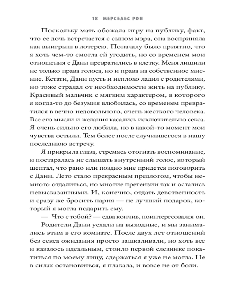 | Аргентинский автор, известный романами в жанре young adult. Она родилась в 1993 году в Буэнос‑Айресе. Начала публиковать тексты в 2015 году, преимущественно на платформе Wattpad. Мерседес Рон получила широкое признание благодаря серии романов «Моя вина». Первая книга быстро стала популярной и набрала 42 миллиона прочтений в Сети. А в 2017 году была напечатана и стала международным бестселлером. В 2023 на Prime video вышла экранизация «Моей вины». Мерседес предпочитает держать свою личную... |