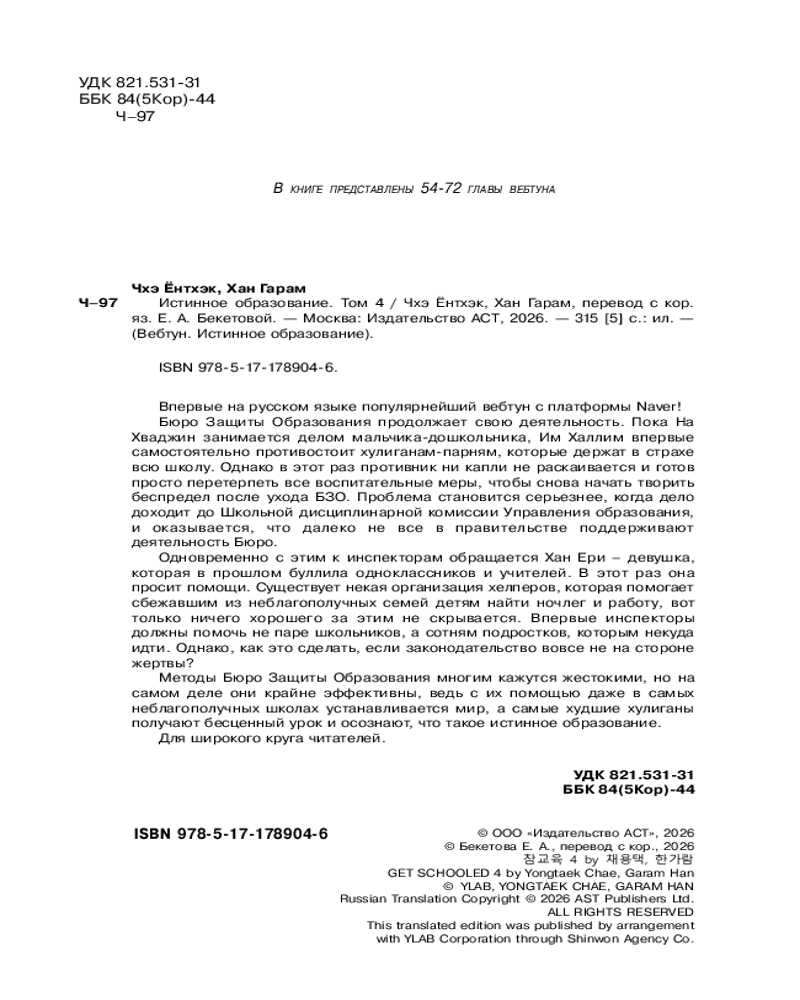💳 Оплатить за товар можно при получении 🇰🇿 Есть бесплатная доставка по Казахстану от 1 дня 🎁 Копите бонусы с каждой покупки Серия: Вебтун. Истинное образование Бюро Защиты Образования продолжает свою деятельность. Пока На Хваджин занимается делом мальчика-дошкольника, Им Халлим впервые самостоятельно противостоит хулиганам-парням, которые держат в страхе всю школу. Однако в этот раз противник ни капли не раскаивается и готов просто перетерпеть все воспитательные меры, чтобы снова начать творить беспредел после ухода БЗО. Проблема становится серьезнее, когда дело доходит до Школьной дисциплинарной комиссии Управления образования, и оказывается, что далеко не все в правительстве поддерживают деятельность Бюро. |