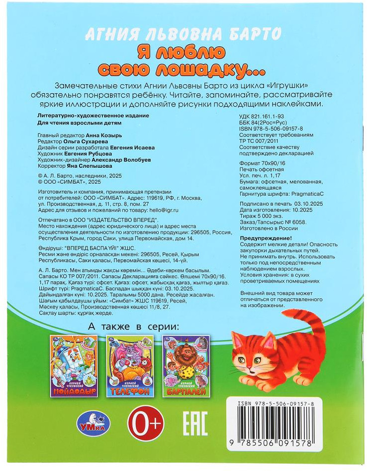💳 Оплатить за товар можно при получении 🇰🇿 Есть бесплатная доставка по Казахстану от 1 дня 🎁 Копите бонусы с каждой покупки Книга-брошюра «А. Л. Барто. Я люблю свою лошадку...» из серии «Сказки и стихи с наклейками» ТМ «УМка» — отличный подарок для ребёнка. Сборник известной детской поэтессы Агнии Барто обязательно понравится малышу. Он с удовольствием будет читать интересные стихи вместе с родителями, рассматривать яркие картинки и дополнять рисунки подходящими наклейками. Удобный формат позволяет взять книгу с собой в путешествие. Чтение книги ТМ «УМка» развивает: образное мышление, визуальное восприятие, внимание, память и речь. |