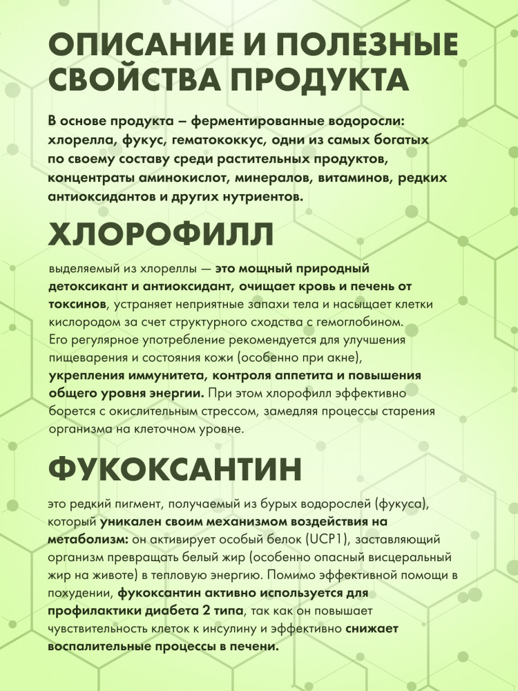 В основе продукта – ферментированные водоросли: хлорелла, фукус, гематококкус, одни из самых богатых по своему составу среди растительных продуктов, концентраты аминокислот, минералов, витаминов, редких антиоксидантов и других нутриентов. Хлорофилл, выделяемый из хлореллы — это мощный природный детоксикант и антиоксидант, очищает кровь и печень от токсинов, устраняет неприятные запахи тела и насыщает клетки кислородом за счет структурного сходства с гемоглобином. Его регулярное употребление рекомендуется для улучшения пищеварения и состояния кожи (особенно при акне), укрепления иммунитета, контроля аппетита и повышения общего уровня энергии. При этом хлорофилл эффективно борется с окислительным стрессом, замедляя процессы старения организма на клеточном уровне.