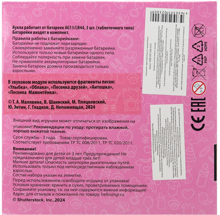 💳 Оплатить за товар можно при получении 🇰🇿 Есть бесплатная доставка по Казахстану от 1 дня 🎁 Копите бонусы с каждой покупки Озвученный пупс «Анечка» ТМ «Карапуз» станет прекрасным подарком для девочки. Этот милый пупс обязательно понравится вашей малышке. Анечка одета в розовый костюмчик, на голове — шапочка в тон отделки. Одежда легко надевается и снимается. С такой куколкой девочка может играть в самые разные игры, гулять с ней, петь песни, кормить, переодевать, рассказывать сказки и укладывать спать. |