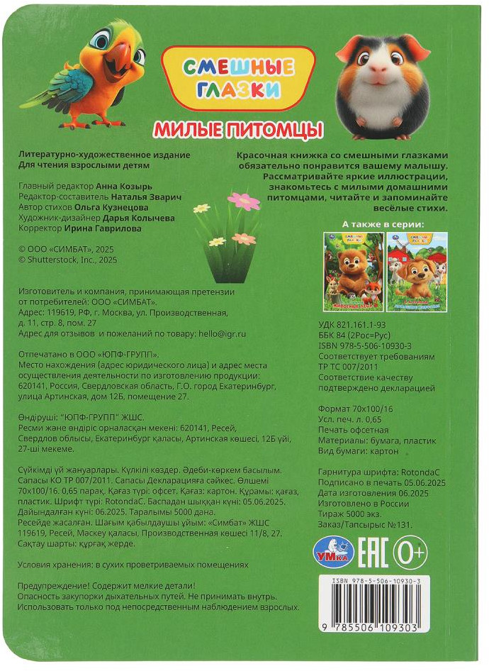 💳 Оплатить за товар можно при получении 🇰🇿 Есть бесплатная доставка по Казахстану от 1 дня 🎁 Копите бонусы с каждой покупки Серия: Смешные глазки Книжка с глазками «В. А. Степанов. Милые питомцы» ТМ «УМка» — отличный подарок для любознательного малыша. Яркая книга с интересными стихами Владимира Степанова непременно заинтересует ребёнка. Большие картинки и смешные подвижные глазки, благодаря которым персонаж выглядит совсем как живой, не оставят равнодушным маленького читателя и подарят ему много весёлых и увлекательных минут игры с этой книгой. |