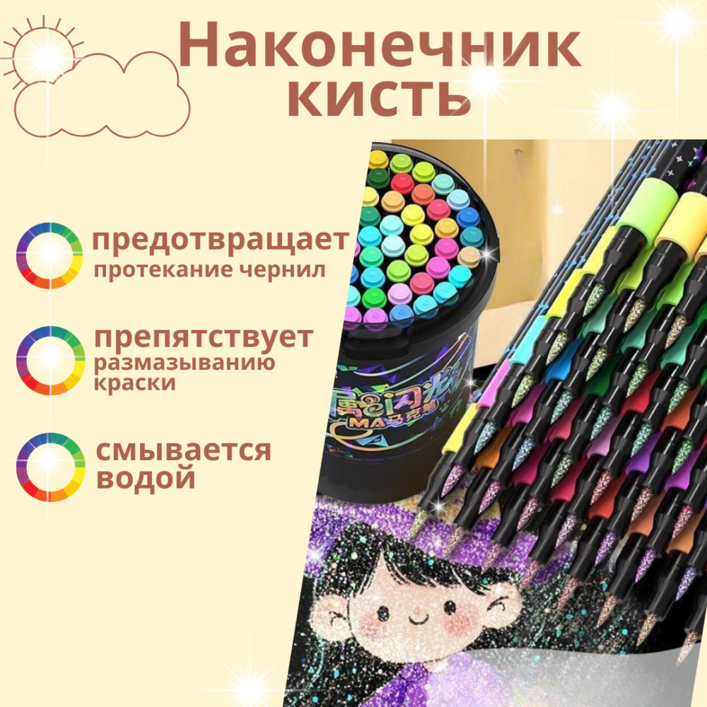 💳 Оплатить за товар можно при получении 🇰🇿 Есть бесплатная доставка по Казахстану от 1 дня 🎁 Копите бонусы с каждой покупки Набор акриловых маркеров с блёстками на водной основе создан для яркого и выразительного творчества. Благодаря наконечнику в форме кисти маркеры позволяют рисовать как тонкие линии, так и широкие мазки, создавая эффектные декоративные элементы с сиянием. |
