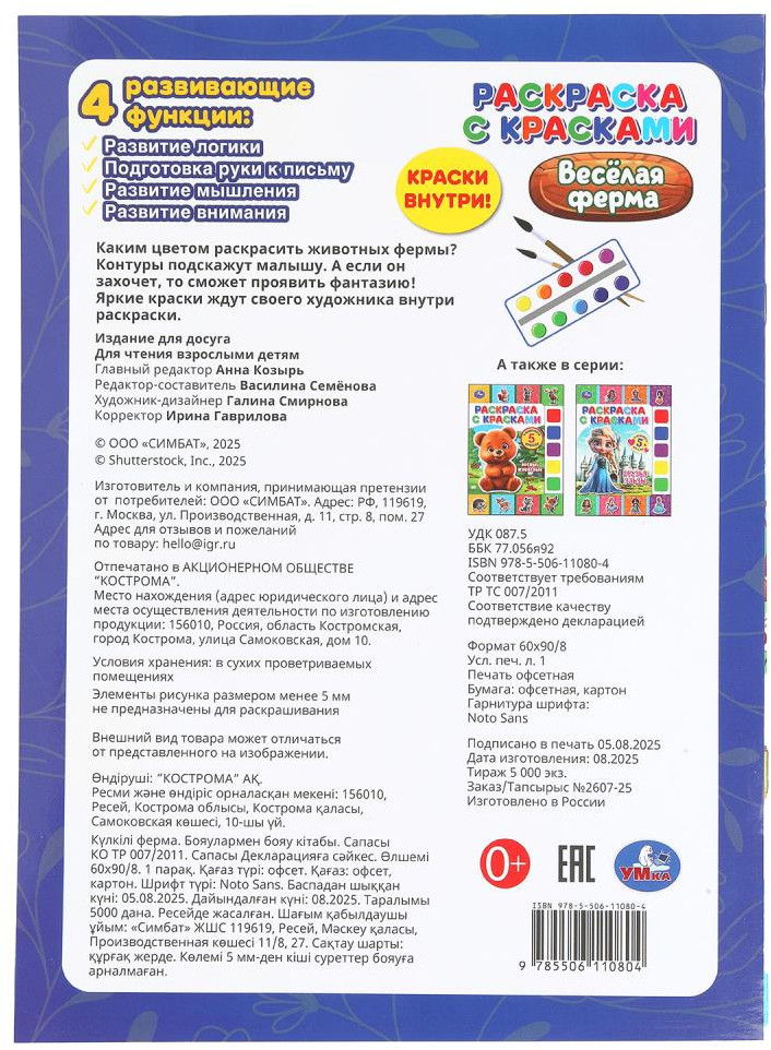 💳 Оплатить за товар можно при получении 🇰🇿 Есть бесплатная доставка по Казахстану от 1 дня 🎁 Копите бонусы с каждой покупки Раскраска с красками «Весёлая ферма» ТМ «УМка» непременно понравится маленькому художнику. Теперь не нужно покупать краски и фломастеры — на последней странице этой замечательной раскраски есть настоящие акварельные краски. Это особенно удобно для спонтанных занятий творчеством: остаётся только коснуться красок мокрой кисточкой и вдохнуть жизнь в иллюстрации, цветной контур которых служит подсказкой, какой цвет выбрать. Стоит отметить, что раскраски с красками особенно полезны для детей младшего возраста, когда они только начинают знакомиться с художественными материалами и нуждаются в простом и понятном формате творчества. |