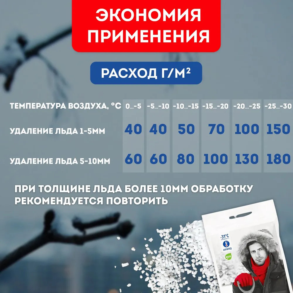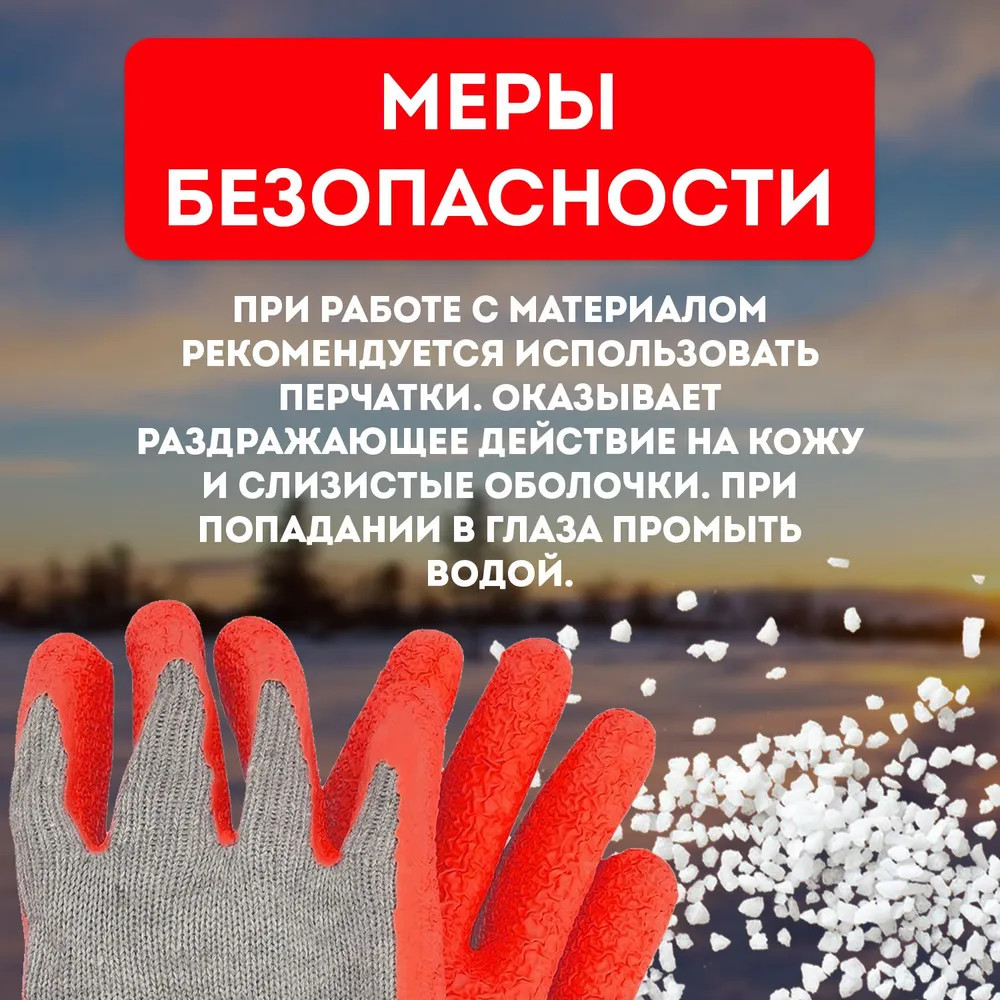 Способы внесения: предварительно очистить поверхность от рыхлого снега. Равномерно рассыпать материал на обрабатываемую поверхность, средний расход материала составляет до 70 г/м2 при толщине льда до 10 мм и температуре до —10°С. Убрать разрушенный лед и снег лопатой, либо щеткой по окончанию процесса плавления льда во избежание повторного образования льда.